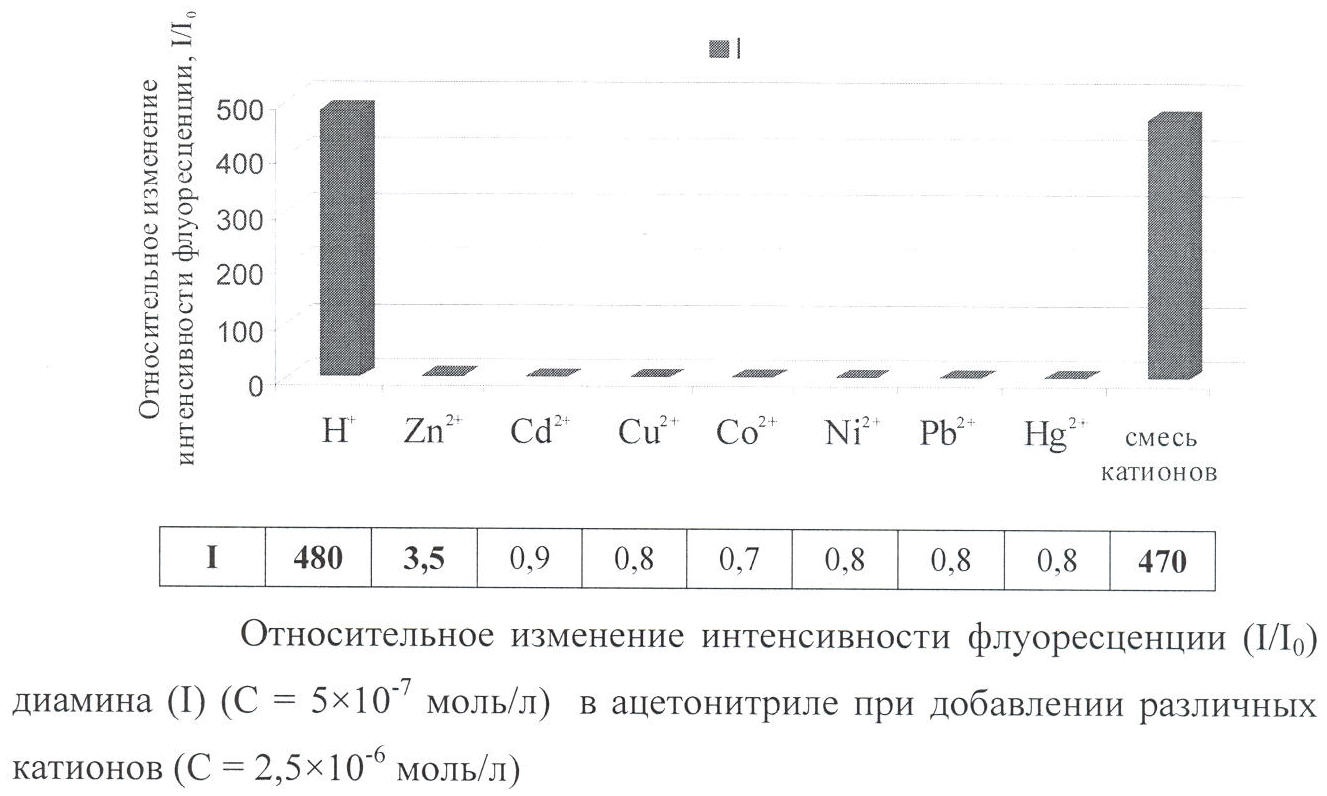 Комплексообразование с различными катионами за счет использования электронной плотности атомов азота существенно видоизменяет термодинамику РЕТ-эффекта, что приводит к изменению интенсивности флуоресценции. Добавление ацетатов Cu2+, Со2+, Ni2+, Pb2+, Hg2+ к раствору сенсора I вызывает незначительное затухание интенсивности флуоресценции, тогда как ионы H+ резко увеличивают интенсивность флуоресценции (I/I0=480) (см. чертеж).