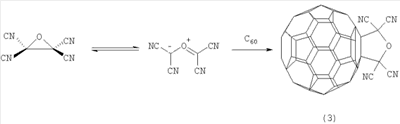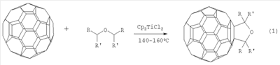 где R=Me, R’=H; R=Pr, R’=H; R=R’=Me. Функционально замещенные фуллерены могут найти применение в качестве комплексообразователей, сорбентов, биологически активных соединений, а также при создании новых материалов с заданными электронными, магнитными и оптическими свойствами. Известен способ ([1] M.Ohno, A.Yashiro, S.Eguchi. Chem. Commun., 1996, 291) получения фуллеродигидрофурана формулы (2) с 27-60% выходом реакцией окислительного циклоприсоединения Известный способ не позволяет получать 2,5-диалкил(2,2,5,5-тетраалкил)-3,4-фуллеро[60]тетрагидрофураны (1). Известен способ ([2] N.Jagerovic, J.Elguero, J.-L.Aubagnac. J.Chem. Soc., Perkin Trans., 1996, 1, 499) получения стабильного тетрагидрофуранового аддукта фуллерена формулы (3) реакцией циклоприсоединения карбонилида, генерированного путем термического раскрытия цикла тетрацианооксирана, к С60 при температуре >100°С по схеме Известный способ не позволяет получать 2,5-диалкил(2,2,5,5-тетраалкил)-3,4-фуллеро[60]тетрагидрофураны (1). Таким образом, в литературе отсутствуют сведения по селективному синтезу 2,5-диалкил(2,2,5,5-тетраалкил)-3,4-фуллеро[60]тетрагидрофуранов (1). Предлагается новый способ получения 2,5-диалкил(2,2,5,5-тетраалкил)-3,4-фуллеро[60]тетрагидрофуранов общей формулы (1). Сущность способа заключается во взаимодействии фуллерена С60 с диалкиловыми (диизоалкиловыми) эфирами в присутствии катализатора титанацендихлорида (Cp2TiCl2), взятыми в мольном соотношении С60:эфир:Ср2TiCl2=0.01:(5-15):(0.0015-0.0025), предпочтительно 0.01:10:0.0020, при температуре 140-160°С в течение 5-7 ч в растворе толуола. Выход 2,5-диалкил(2,2,5,5-тетраалкил)-3,4-фуллеро[60]тетрагидрофуранов (1) составляет (по данным ВЭЖХ) 47-70%. В количестве 3-10% образуется продукт присоединения двух молекул эфира к фуллерену[60]. Реакция протекает по схеме R=Me, R’=H R=Pr, R’=H R=R’=Me. Диалкиловый (диизоалкиловый) эфир берут с избытком по отношению к фуллерену С60 с целью повышения выхода целевого продукта (1). Снижение количества эфира по отношению к С60 нецелесообразно, так как приводит к уменьшению выхода целевого продукта. 2,5-Диалкил(2,2,5,5-тетраалкил)-3,4-фуллеро[60]тетрагидрофураны (1) образуются только с участием фуллерена[60] и диалкиловых (диизоалкиловых) эфиров. Проведение указанной реакции в присутствии катализатора титанацендихлорида Cp2TiCl2 больше 25 мол. % по отношению к С60 не приводит к существенному увеличению выхода целевого продукта (1). Использование катализатора титанацендихлорида Cp2TiCl2 менее 15 мол. % по отношению к С60 снижает выход продукта (1), что связано, возможно, со снижением каталитически активных центров в реакционной массе. Изменение соотношения исходных реагентов в сторону значительного увеличения содержания эфира по отношению к фуллерену[60] приводит к присоединению дополнительных молекул исходного эфира к молекуле С60. Существенные отличия предлагаемого способа 1. Предлагаемый способ базируется на использовании в качестве исходных реагентов диалкиловых (диизоалкиловых) эфиров и катализатора Cp2TiCl2. В известном способе используется тетрацианооксиран. Предлагаемый способ, в отличие от известного, позволяет селективно получать 2,5-диалкил(2,2,5,5-тетраалкил)-3,4-фуллеро[60]тетрагидрофураны (1), синтез которых в литературе не описан. Способ поясняется следующими примерами ПРИМЕР 1. В металлический автоклав объемом 17 мл в атмосфере аргона помещают 0.01 ммоля фуллерена С60, 10 мл «сухого» толуола, 10 ммоль диэтилового эфира и 0.002 ммоль катализатор