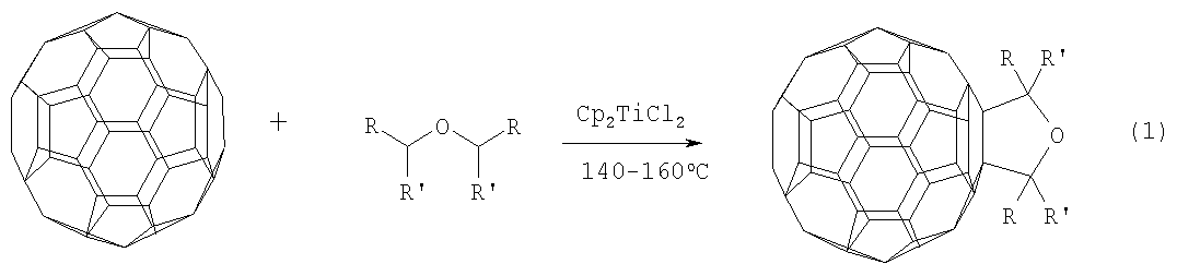 где R=Ме, R’=H; R=Pr, R’=H; R=R’=Me, заключающемуся во взаимодействии фуллерена С60 с диалкиловыми (диизоалкиловыми) эфирами общей формулы (RR’CH)2O, где R=Me, R’=H; R=Pr, R’=H, R=R’=Me в присутствии катализатора титанацендихлорида в мольном соотношении С60:эфир:Ср2ТiСl2=0.01:(5-15):(0.0015-0.0025) в среде толуола при температуре 140-160°С в течение 5-7 часов. Выход целевого продукта составляет 47-70%. Эти соединения могут найти применение в качестве комплексообразователей, сорбентов, биологически активных соединений, а также при создании новых материалов с заданными электронными, магнитными и оптическими свойствами. 1 табл.