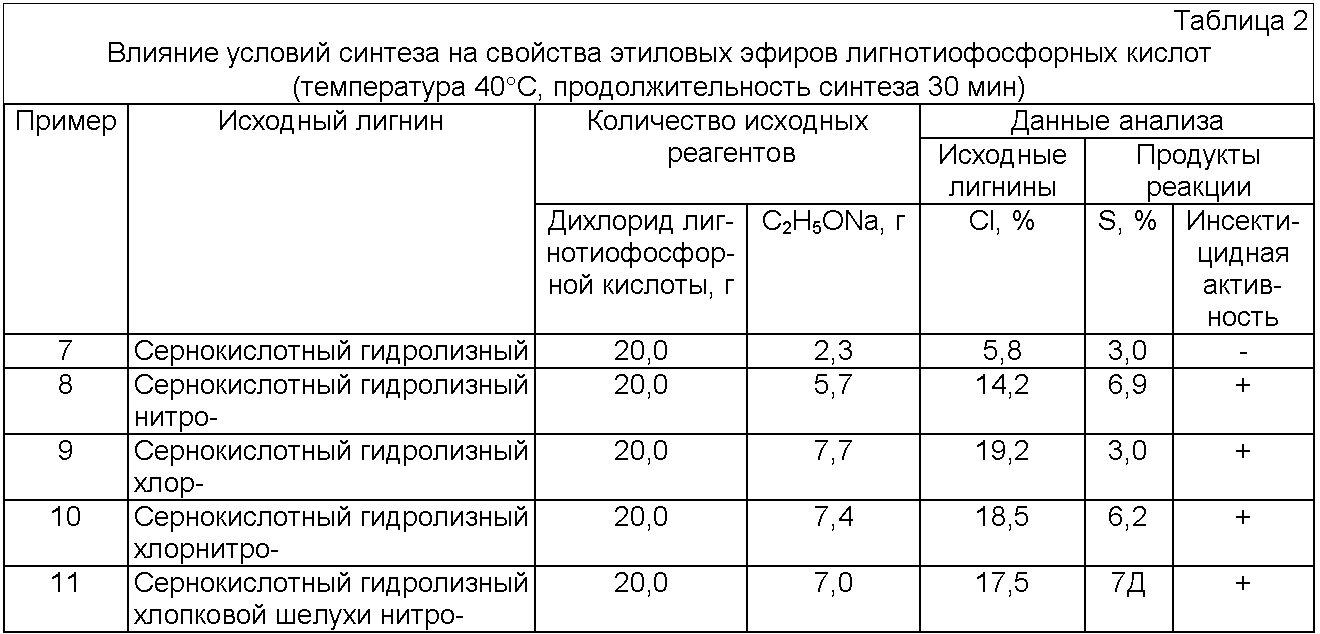 Изобретение относится к области химической технологии древесины и предназначено для получения эфиров О,О-диалкилтиофосфорных кислот лигнинов и их производных, содержащих в своем составе электроноакцепторные атомы или группы атомов (-NO2; -NO2 и -Cl; -CN и др.), которые могут быть использованы в качестве химических средств защиты растений (инсектицидов). Ближайшими аналогами O,O-диалкилтиофосфорных кислот функциональных производных лигнинов являются O,O-диэтил-O-(n-нитрофенил)тиофосфат (паратион, Е-605, фолидол, ниран, тиофос и др.), O,O-диметил-O-(n-нитрофенил)тиофосфат (метилпаратион, метацид, дальф и др.), O,O-диметил-O-(3-хлор-4-нитрофенил)тиофосфат (хлортион, байер 22/190) [Г.Шрадер. Новые фосфорорганические инсектициды / Пер. с нем. под ред. Н.Н.Мельникова. М., 1965, С.255-309]. Для получения, например, O,O-диэтил-O-(n-нитрофенил)тиофосфата (тиофоса) используют следующую методику [Патент ФРГ
