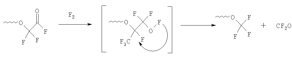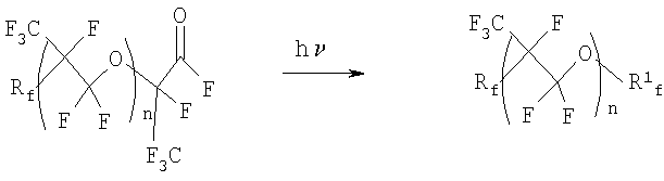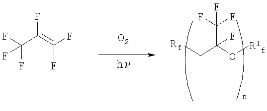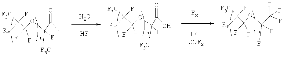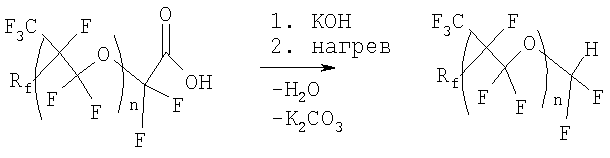 Изобретение относится к получению высокостабильных, химически стойких перфторполиэфиров, на основе гексафторпропилена, широко используемых в качестве смазочных масел, жидких диэлектриков, запорных жидкостей, пластификаторов и модификаторов, поверхностно-активных веществ и других продуктов. Известен периодический способ получения полигексафторпропиленоксида (ПГФПО) фотохимической сополимеризацисй гексафторпропилена (ГФП) с кислородом, барботируемым через массу мономера до конверсии последнего не более 30%. Выход ПГФПО на прореагировавший мономер составляет 90%. Увеличение конверсии гексафторпропилена приводит к резкому снижению выхода целевого продукта. Способ имеет низкую производительность и весьма ограниченную возможность регулирования молекулярной массы ПГФПО (SU 211090, 01.01.1968). Известен другой способ получения ПГФПО сополимеризацией ГФП с кислородом при минус 30 – минус 65°С в присутствии инициатора полимеризации, в качестве которого используют УФ-облучение (фотохимическая сополимеризация). Процесс осуществляют непрерывно, реакционную массу выводят из зоны реакции потоком ГФП, непрерывно циркулирующим со скоростью 0,2-1,0 л/ч на 1 л объема. ПГФПО выделяют путем нагревания смеси от -20 до +50°С, а низкомолскулярные газообразные побочные продукты отделяют от ГФП охлаждением газовой фары при температуре от минус 120 до минус 60°С. ГФП возвращают в зону реакции (SU 410040, 1974). Производительность этого способа в 2-3 раза выше, чем периодического, а конверсия ГФП в целевой продукт практически неограниченна. Однако этому способу присущи: – низкий КПД источников УФ-излучения (экспериментально установлено, что 5-7% мощности ламп расходуется на получение продукта, а остальное на образование паразитного тепла); – большое количество побочных низкомолекулярных продуктов (1.5 моля COF2 на 1 моль ПГФПО); – ограниченная возможность варьирования молекулярной массы ПГФПО, определяемой концентрацией растворенного кислорода, температурой реакционной массы и интенсивностью УФ-излучения из-за трудности регулирования тепломассообмена. Известно, что при фотоокислении ГФП образуется смесь олигомеров, которые содержат активные фторангидридные концевые группы. Для того чтобы сделать их пригодными для применения в качестве высокотемпературных смазочных масел, теплоносителей и т.д., разработаны различные методы обработки концевых фторангидридных групп перфторполиэфиров. Реакцию фотоокисления ГФП кислородом при низкой температуре (минус 30 -минус 70°С) можно представить следующим образом: Rf=CF3O, CF3CF2O – стабильные группы; R1 n=3-50. Из патента СА 701360, 1965 известно замещение концевых групп в перфторполиэфирах на водород при гидролизе и последующем пиролизе калиевых солей при температуре 115-200°С. Образующиеся в результате такой обработки масла отличаются высокой стабильностью. Выход на стадии стабилизации превышает 90%. Однако водородсодержащие ПГФПО обладают более слабыми поверхностно-активными свойствами, чем полностью фторированные ПГФПО, а также большей реакционной способностью. Миллеру удалось получить еще более стабильные концевые группы (US 3242218, 22.03.1966). Исходный ПГФПО подвергают гидролизу до чистых кислот, которые затем фторируют при температуре 184-187°С в инертном растворителе, например, в перфтордиметилциклобутане: Выход и степень превраще