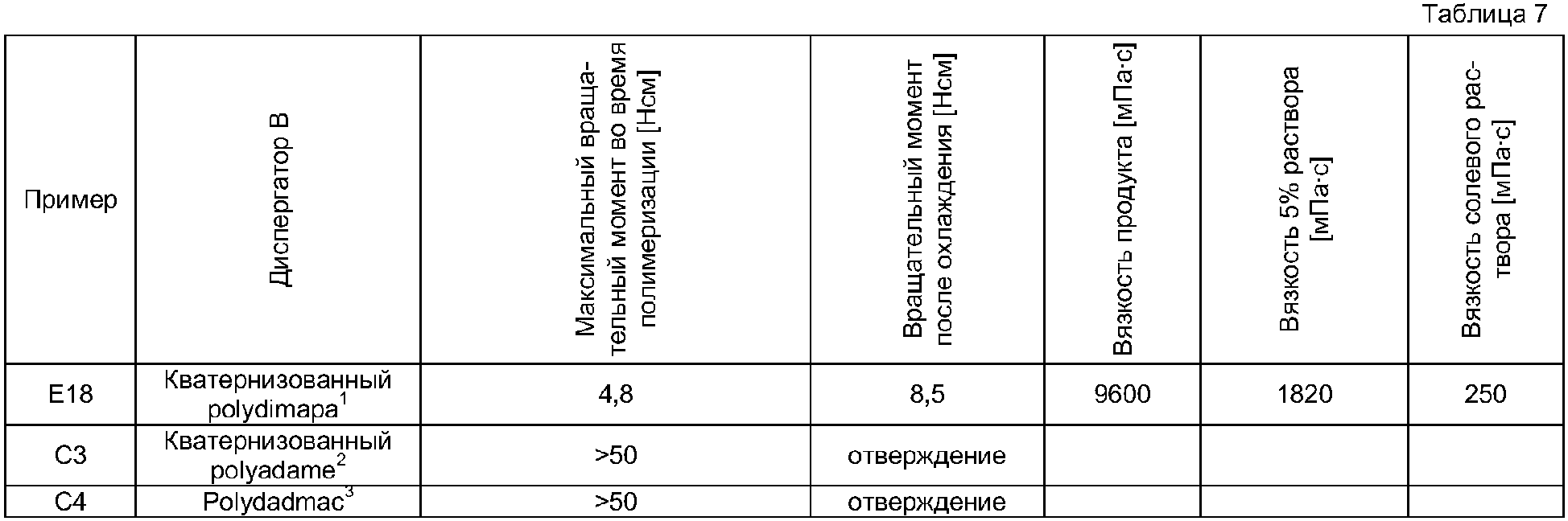 Пример E18 и сравнительные примеры C3 и C4 (все содержат 50 мас.% катионного мономера в полимере A и диспергатор B с MW 180000) 360 г диспергатора (поли(хлорида триметиламмонийпропилакриламида)) добавляли к раствору 190 г акриламида (50%), 316 г воды, 2 г Versenex 80 (5%), 119 г хлорида триметиламмонийметилакрилата (80%). Смесь помещали в 2-литровую колбу, снабженную KPG-мешалкой, и нагревали до начальной температуры 35°C. После удаления кислорода путем продувания азотом добавляли 50 частей на млн дисульфита натрия, 50 частей на млн пероксидисульфата натрия и 5 частей на млн трет-бутилгидропероксида. После достижения температурного максимума добавляли инициатор (400 частей на млн ABAH), и полученной смеси позволяли взаимодействовать в течение еще 15 минут при этой температуре. Затем добавляли 5 г лимонной кислоты. Конечный продукт охлаждали и фасовали. В таблице 7, приведенной ниже, показаны результаты теста. 1Катионный полимер, основанный на диметиламинопропилакриламиде, кватернизованном метилхлоридом; 2Катионный полимер, основанный на диметиламиноэтилакрилате, кватернизованном метилхлоридом; 3Катионный полимер, основанный на хлориде диаллилдиметиламмония. ПРИМЕРЫ ПРОМЫШЛЕННОГО ПРИМЕНЕНИЯ Измерение скорости обезвоживания суспензии бумажной массы С применением аппарата DFS 03 от BTG Mütek скорость обезвоживания как функцию времени определяли путем добавления полимерных дисперсий по изобретению к специфическим суспензиям бумажной массы. С этой целью полимерные дисперсии по изобретению приводились к концентрации 0,1 мас.% с применением деионизированной воды. 300 г 1% стандартной суспензии макулатурной бумажной массы (зольность 15%, 57°SR*) разбавляли водопроводной водой до 1000 мл в тестере свободности по Шоппер-Риглеру (Schopper-Riegler). Тесты на обезвоживание проводили при 3 различных концентрациях полимерной дисперсии по изобретению (400/800/1200 г/л). Как правило, шламовую водную смесь удерживали при 600 мин-1 в течение 25 секунд, и разбавленную дисперсию по изобретению дозировали после первых 10 секунд. Обезвоживание происходило в пределах 60 секунд, но самое большее с 500 г. Время обезвоживания для 500-граммовых различных полимерных дисперсий и концентраций может быть найдено в нижеследующей таблице. *Специальное состояние пульпы при очистке выражено как свободность в °SR (градусы Шоппер-Риглера).