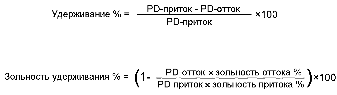 Определение удерживания и зольности С применением аппарата DFS 03 от BTG Mütek удерживание измеряли путем добавления полимерных дисперсий по изобретению к определенным суспензиям бумажной массы. С этой целью полимерные дисперсии по изобретению приводились к концентрации 0,1 мас.% с применением деионизированной воды. 500 г 1% стандартной суспензии макулатурной бумажной массы разбавляли водопроводной водой до 1000 мл в тестере свободности по Шоппер-Риглеру. Тесты на удерживание проводили при 3 различных концентрациях полимерной дисперсии по изобретению (400/800/1200 г/л). Обычно пульповую водную смесь выдерживали при 600 мин-1 в течение 25 секунд, разбавленную полимерную дисперсию дозировали после первых 10 секунд, и фильтрат после удерживания удаляли после следующих 15 секунд, пропускали через фильтр Шварцбанда (Schwarzband) и высушивали до постоянной массы при 105°C в течение 1 часа. Для того чтобы определить зольность удерживания, золь получали при 550°C в течение 2 часов, и зольный остаток повторно взвешивали в абсолютно сухих условиях. PD-приток: плотность пульпы притока (суспензия пульпы) в мас.%. PD-отток: плотность пульпы фильтрата (обратный ток воды) в мас.%. Зольность оттока: процент минерального остатка после сжигания в мас.% фильтрата (обратный ток воды). Зольность притока: процент минерального остатка после сжигания в мас.% притока (суспензии пульпы).