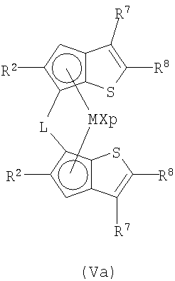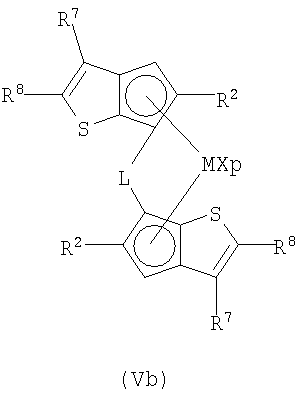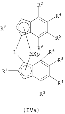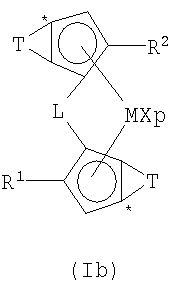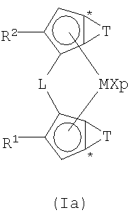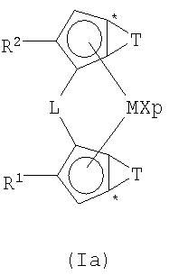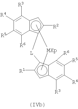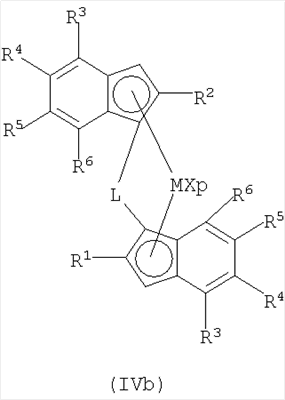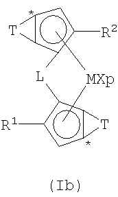 где R1, R2, T, L, M, X и р определены, как описано выше, и где атомы, отмеченные символом *, связаны с атомами, отмеченными таким же символом, в остатках формул (IIa), (IIb) или (IIc). с) алюмоксана или соединения, способного образовать алкильный металлоценовый катион; и, необязательно, d) алюмоорганического соединения. Предпочтительно соотношение между рацемической или рацемоподобной формой и мезо- или мезоподобной формой находится в интервале от 10:90 до 90:10, более предпочтительно от 20:80 до 80:20, еще более предпочтительно от 30:70 до 70:30. В одном осуществлении соединения формул (Ia) и (Ib) имеют соответственно формулы (IVa) или (IVb): где M, X, p, L, R1, R2, R3, R4, R5 и R6 имеют описанные выше значения. В альтернативном осуществлении соединения формул (Ia) и (Ib) имеют соответственно формулы (Va) или (Vb):