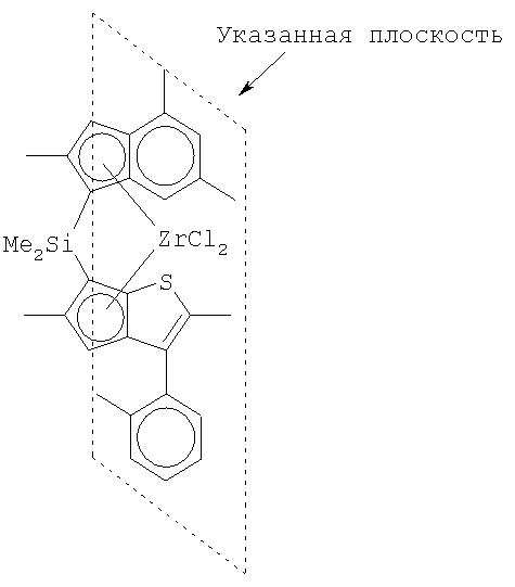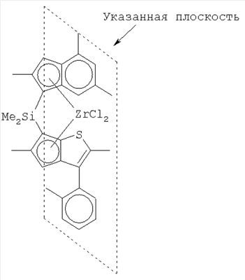 в которой R9, R10, R11, R12 и R13, одинаковые или отличающиеся друг от друга, представляют атомы водорода либо линейные или разветвленные, циклические или ациклические С1-С20-алкильный, С2-С20-алкенильный, С2-С20-алкинильный, С6-С20-арильный, С7-С20-алкиларильный или С7-С20-арилалкильный радикалы, необязательно содержащие гетероатомы, принадлежащие группам 13-17 Периодической системы элементов; предпочтительно R9 и R12 представляют атомы водорода; R10, R11 и R13 предпочтительно представляют атомы водорода либо линейные или разветвленные, циклические или ациклические С1-С10-алкильные радикалы; b) алюмоксана или соединения, способного образовать алкильный металлоценовый катион; и, необязательно, c) алюмоорганического соединения. Такой тип процесса описан в ЕР 0410912.6 и РСТ/ЕР 2005/004506. Для цели настоящего изобретения термин “мезоформа” означает, что одни и те же заместители на двух циклопентадиенильных остатках находятся на одной и той же стороне относительно плоскости, содержащей цирконий и центр указанных циклопентадиенильных остатков. “Мезоподобная форма” означает, что более объемные заместители двух циклопентадиенильных остатков металлоценового соединения находятся на одной и той же стороне относительно плоскости, содержащей цирконий и центр указанных циклопентадиенильных остатков, как показано на следующем соединении: Изотактический полимер на основе 1-бутена, выбранный из изотактического гомополимера 1-бутена, изотактического сополимера 1-бутена, содержащего до 5 мол.% производных от этилена элементарных звеньев, изотактического сополимера 1-бутена, содержащего до 50 мол.% производных от пропилена элементарных звеньев, или изотактического сополимера 1-бутена и одного или нескольких альфа-олефинов формулы CH2=CHZ, где Z представляет С3-С10-алкильную группу, содержащего до 20 мол.% элементарных звеньев, производных от указанных альфа-олефинов, используемый как компонент b), предпочтительно имеет более 85% изотактических пентад (mmmm), определяемых методом 13С-ЯМР; более предпочтительно больше 90%; еще более предпочтительно больше 95%. Температура плавления компонента b) предпочтительно превышает 90°С; более предпочтительно температура плавления превышает 100°С; еще более предпочтительно превышает 104°С. Характеристическая вязкость (I.V.), измеренная в тетрагидронафталине (ТГН) при 135°С, находится между 0,5 дл/г и 4,0 дл/г; предпочтительно между 1,0 дл/г и 3,0 дл/г, еще более предпочтительно характеристическая вязкость (I.V.) выше 1,1 дл/г и ниже 2,5 дл/г. Предпочтительно в качестве компонента b) используют гомополимер 1-бутена. Изотактический полимер на основе 1-бутена, используемый в качестве компонента b) согласно настоящему изобретению, может быть получен или с использованием катализаторной системы на основе титана, нанесенной на MgCl2, или с использованием системы на основе одноцентрового катализатора, такой как, например, катализаторная система на основе металлоцена. Процессы, используемые для получения такого типа полимеров, описаны, например, в WO 99/45043, WO 03/099883, EP 172961, WO 02/100908, WO 02/100909, WO 03/014107 и ЕР 03101304.8. Когда компонент b) композиции согласно настоящему изобретению получают с использованием системы на основе одноцентрового катализатора, предпочтительно катализаторной системы на основе металлоцена, он обладает распределением молекулярного веса (Mw/Mn), которое равно или н
