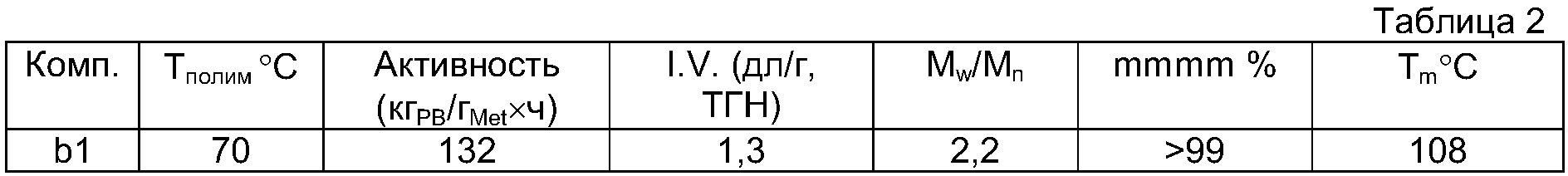 где символы обозначают следующее: XI% = массовое процентное содержание нерастворимой фракции; XS% = массовое процентное содержание растворимой фракции. Приготовление компонентов а): общая методика Мезо(дихлорид диметилсиландиил-бис-6-[2,5-диметил-3-(2 Полимеризация Катализаторную смесь готовили растворением 3 мг металлоцена (А-1) в 4-8 мл толуола с надлежащим количеством раствора МАО (соотношение Al(MAO)/Zr=500), получая раствор, который перемешивали в течение 10 мин при комнатной температуре перед впрыском в автоклав. 6 ммоль Al(i-Bu)3 (TIBA) (в виде 1М раствора в гексане) и 1350 г 1-бутена загружали при комнатной температуре в 4-л автоклав из нержавеющей стали с рубашкой, оборудованный мешалкой с магнитным приводом и 35-мл ампулой из нержавеющей стали, соединенный с термостатом для регулирования температуры и предварительно очищенный промывкой раствором Al(i-Bu)3 в гексанах и высушенный при 50°С потоком азота. Затем автоклав термостатировали при температуре полимеризации, приведенной в таблице 1, и катализаторную систему, приготовленную, как описано выше, впрыскивали в автоклав под действием давления азота из ампулы из нержавеющей стали. Полимеризацию проводили при постоянной температуре в течение 1 час. Затем перемешивание прерывали, давление в автоклаве поднимали азотом до 20 бар (изб.). Открывали донный разгрузочный клапан и смесь 1-бутен/поли-1-бутен выгружали снизу в подогретую стальную емкость, содержащую воду при 70°С. Подогрев емкости отключали и подавали поток азота при 0,5 бар (изб.). После охлаждения при комнатной температуре стальную емкость открывали и отбирали влажный полимер. Влажный полимер сушили в сушильном шкафу при пониженном давлении при 70°С. Полученные полимеры экстрагировали диэтиловым эфиром согласно описанной выше методике. Полученные в результате образцы полимеры были полностью растворимы в диэтиловом эфире (100%). Условия полимеризации и данные, характеризующие полученные полимеры, приведены в таблице 1. Приготовление компонента b) Компонент b1) готовили согласно методике, описанной в WO 02/100908, следующим образом: Рац – (дихлорид диметилсиландиил-бис-6-[2,5-диметил-3-(2 Катализаторную смесь готовили растворением 3 мг металлоцена (А-2) в 4-8 мл толуола с надлежащим количеством раствора МАО (соотношение Al(MAO)/Zr=200), получая раствор, который перемешивали в течение 10 мин при комнатной температуре перед впрыском в автоклав. 6 ммоль Al(i-Bu)3 (TIBA) (в виде 1М раствора в гексане) и 1350 г 1-бутена загружали при комнатной температуре в 4-л автоклав из нержавеющей стали с рубашкой, оборудованный мешалкой с магнитным приводом и 35-мл ампулой из нержавеющей стали, соединенный с термостатом для регулирования температуры и предварительно очищенный промывкой раствором Al(i-Bu)3 в гексанах и высушенный при 50°С потоком азота. Затем автоклав термостатировали при температуре полимеризации, приведенной в таблице 1, и катализаторную систему, приготовленную, как описано выше, впрыскивали в автоклав посредством давления азота из ампулы из нержавеющей стали. Полимеризацию проводили при постоянной температуре в течение 1 час. Затем перемешивание прерывали, давление в автоклаве поднимали азотом до 20 бар (изб.). Открывали донный разгрузочный клапан и смесь 1-бутен/поли-1-бутен выгружали снизу в подогретую стальную емкость, содержащую воду при 70°С. Подогрев емкости отключали и по