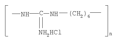 Компонентами, используемыми при создании биоцидного эпоксидного состава для покрытий, контактирующих с нефтепродуктами, являются: 1. Эпоксидная эмаль ТАНЭП-622 (ТУ 2312-009-50928500-2003), содержащая в своем составе следующие ингредиенты: – эпоксидная смола (низкомолекулярная) – пигменты, – наполнители, – модификатор – аэросил, – активный разбавитель – лапроксид (триглициловый эфир полиоксипропилентриола), – отвердитель – полиаминофенол и полиамидная смола. 2. Полигексаметиленгуанидин гидрохлорид (ПГМГ) (ТУ 9392-007-21060124-94). Структурная формула ПГМГ: