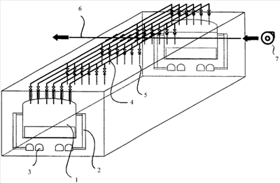 Система, расположенная над камерой коксования, состоит из линий подачи 4, каждая из которых соединена с множеством отверстий 5 для подачи. Упомянутые линии подачи 4 присоединены к общей коллекторной системе 6, в которой создают небольшое повышенное давление с помощью воздуходувки 7.