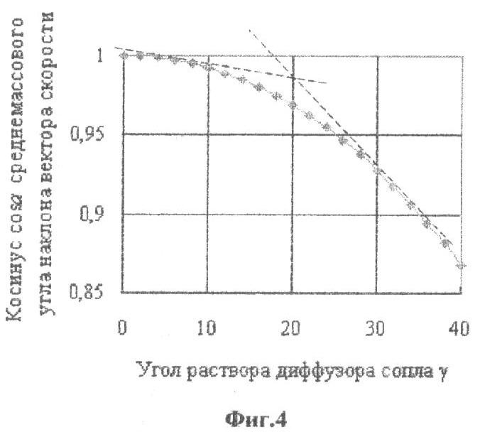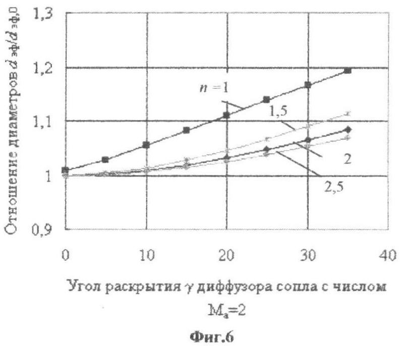 На фиг.4 приведена зависимость косинуса среднемассового угла наклона вектора скорости струи в выходном сечении сопла cos [4] (определяющего продольную составляющую импульса струи) от угла раскрытия диффузора конического сопла Лаваля. На фиг.5-7 приведены зависимости относительного диаметра струи в эффективном сечении (где dэф,0 – диаметр эффективного сечения струи при угле раскрытия диффузора сопла , равном нулю. в случае n=1 величина и