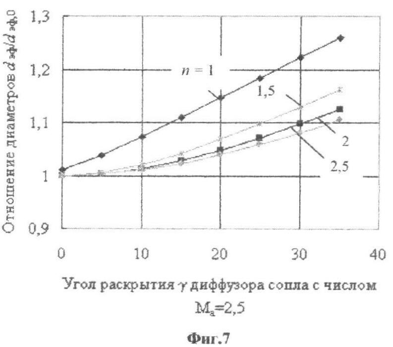 dэф,0 совпадает с величиной выходного диаметра сопла dа) от угла раскрытия (раствора) диффузора сопла при различных числах Маха сопла Ма (в диапазоне, используемом в металлургической практике Ма=1,5-2,5) и при различных степенях нерасчетности n истечения струй.