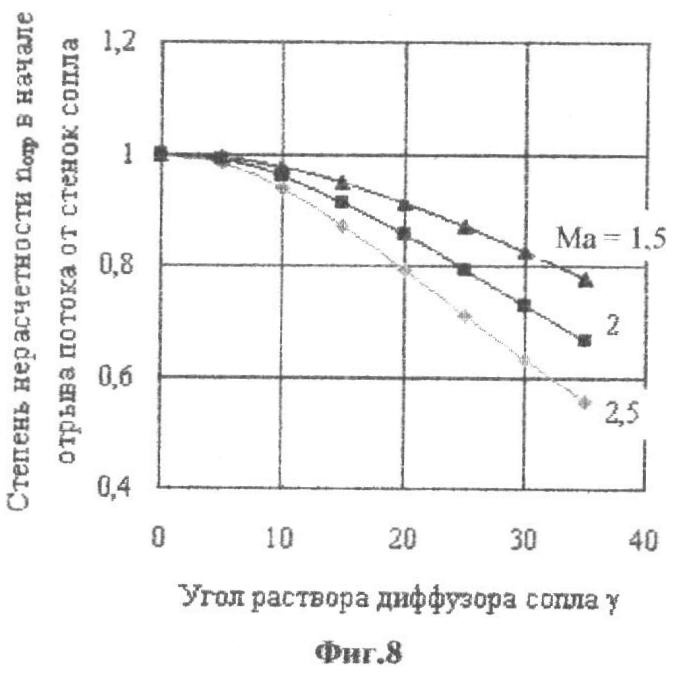 Кроме того, при использовании в головке фурмы конических сопел Лаваля с углом раскрытия диффузора , находящегося в заявленном диапазоне значений ( min   max), процесс продувки протекает более стабильно. Это связано с тем, что при увеличении диаметра первой «бочки», а также радиальной составляющей скорости истечения струи дутья положение корня струи является более устойчивым к внешним возмущениям (меньше амплитуда и частота автоколебаний струи). При этом также существенно расширяется диапазон значений n по безотрывной работе сопла (при понижении n вплоть до 0,6-0,7 при используемых в металлургической практике значениях чисел Маха сопел Mа=1,5-2,5) – см. фиг.8, на которой приведены зависимости степени нерасчетности начала отрыва потока от стенок сопла nотр от угла раскрытия диффузора сопла при различных Mа. Это приводит, с одной стороны, к увеличению стойкости сопел к эрозийному износу и фурм в целом, а, с другой, – к повышению эффективности продувки плавки вследствие лучшей организации кислородных струй в рабочем пространстве агрегата и снижению потерь энергии дутья, связанных с «деформацией» выходных участков сопел и возникновением отрывных течений. Это позволяет также проводить продувку плавок в оптимальной области по n – вблизи расчетного режима истечения струй (при n=0,8÷1,2), что приведет к минимизации потерь потенциальной энергии давления потока в сопле и повышению эффективности продувки сталеплавильной ванны. Увеличенный диаметр первой «бочки» позволяет дополнительно защитить выходную кромку сопла и присопловую область наконечника фурмы от попадания брызг металла и шлака, что способствует повышению стойкости выходных кромок сопел и наконечника фурмы. Кроме того, при использовании сопел с углом раскрытия диффузоров, находящимся в заявленном диапазоне ( min   max), имеет место (при прочих равных условиях) значительно меньшая длина диффузора (наиболее высокоскоростного участка) сопла, что приводит к уменьшению потерь давления дутья в спилах и, как следствие, к повышению эффективности продувки.
