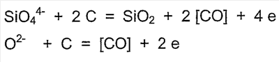 Из-за ионной структуры жидкого шлака постоянный ток инициирует электролиз шлака. Катодное восстановление и анодное окисление результируются в восстановление магнетита, отделение меди и образование монооксида углерода на электродах, что соответствует реакциям: