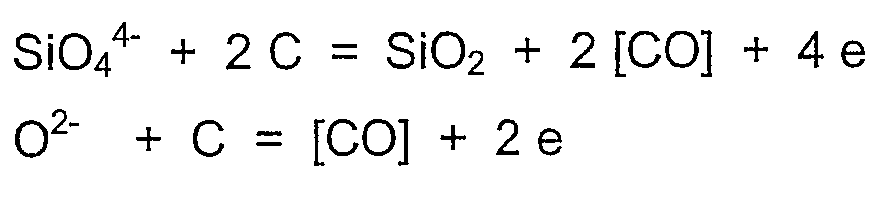Во время восстановления имеет место, в сущности, известный процесс, который – на примере добавления кокса – выглядит следующим образом: магнетит и медьсодержащий оксид в шлаке реагируют с углеродом графитовых электродов 9, 10 и добавленным коксом согласно уравнениям:
