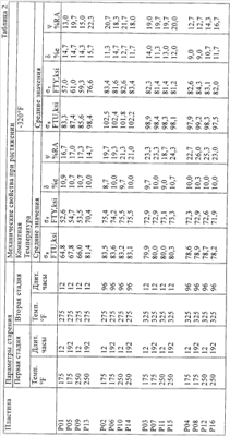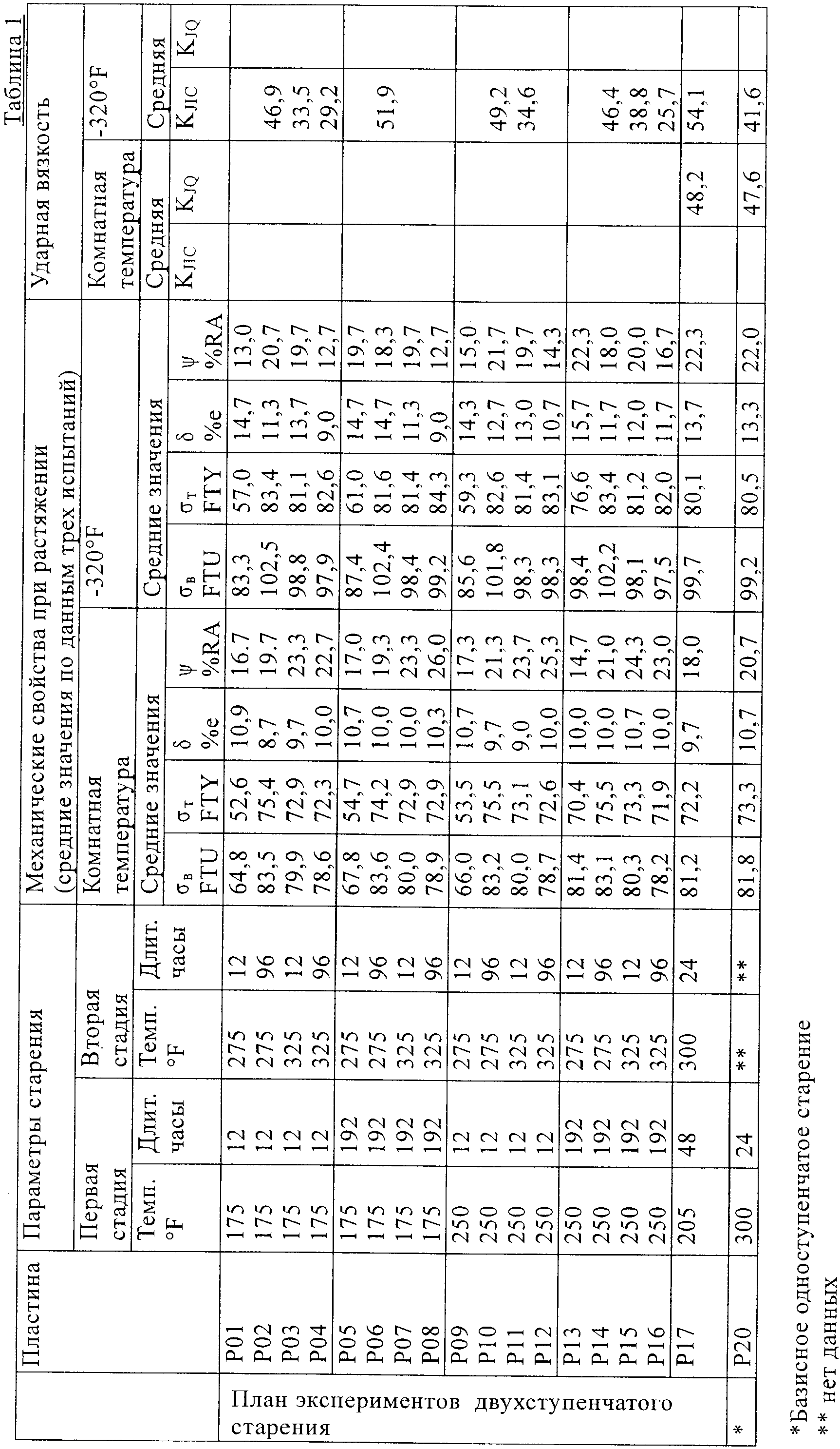 Образцы пластин сгруппированы по параметрам первой стадии старения. В каждую группу с одинаковыми параметрами первой стадии старения, но различными параметрами второй стадии старения входят по 4 образца пластин, например Р01-Р04. Образец пластины Р17 отображает средние значения параметров двухступенчатого старения. В столбцах с 6 по 13 (слева направо) приведены результаты испытаний на растяжение. Как следует из таблицы 1, в качестве единицы измерения предела прочности в (FTU) использован ksi (килофунт или 1000 фунтов на квадратный дюйм), в качестве единицы измерения предела текучести т (FTY) – также ksi, для каждого образца пластин при комнатной температуре и при криогенной температуре (-320°F) измерялось относительное удлинение при разрыве (%е), выраженное в процентах, и относительное сужение (%RA), также выраженное в процентах. Полученные данные предела прочности в (FTU) использованы для сравнения различных циклов старения. Большие числа соответствуют большей прочности образцов пластин и, следовательно, большей прочности на разрыв при растяжении. В последних четырех столбцах таблицы 1 приведены результаты испытаний на ударную вязкость при комнатной температуре и криогенной температуре (-320°F). Параметры КJIС и kjQ, измеренные в ksi in (килофунтах на квадратный дюйм, умноженных на квадратный корень из дюйма), определены по методу Е1820 ASTM. Большие числа соответствуют большей ударной вязкости испытанных образцов пластин.