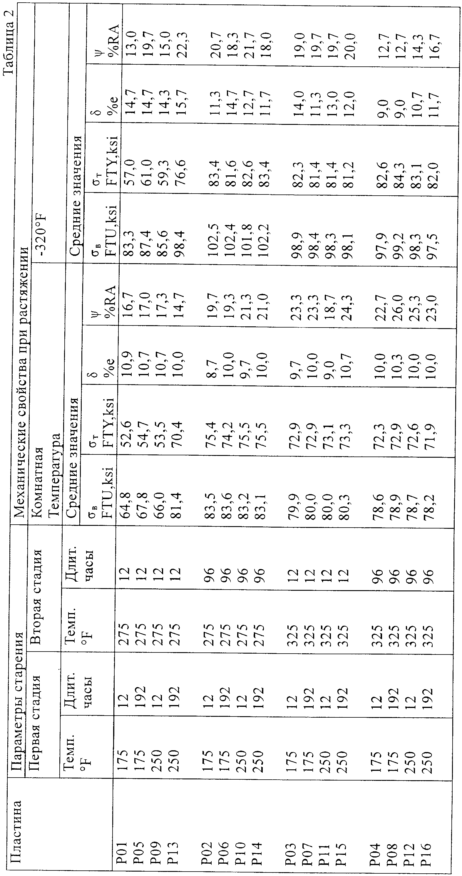 В таблице 2 приведены данные о механических свойствах образцов пластин Р01-Р16 при растяжении, которые сгруппированы по параметрам второй стадии старения согласно одному из вариантов осуществления настоящего изобретения. В каждой группе объединены образцы пластин с одинаковыми параметрами второй стадии старения, включая температуру на второй стадии и длительность второй стадии старения, и различными параметрами первой стадии старения, включая температуру на первой стадии и длительность первой стадии старения. Как следует из таблицы 2, в результате изменения параметров первой стадии старения при неизменном режиме проведения второй стадии старения конечные механические свойства при растяжении, например, предел прочности в (FTU) и предел текучести т (FTY) при комнатной или при криогенной (-320°F) температуре не изменились. Соответственно, механические свойства при растяжении и ударная вязкость алюминиево-литиевого сплава С458 главным образом зависят от осуществления второй стадии старения.