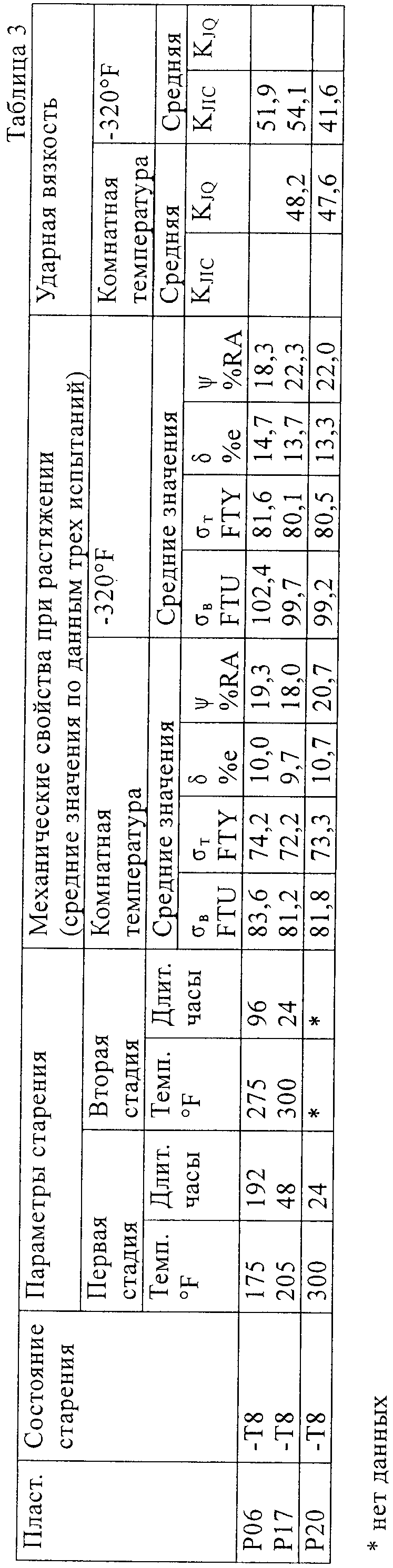 В таблице 3 приведены механические свойства при растяжении и ударная вязкость образцов пластин Р06, Р17 и Р20 по одному из вариантов осуществления настоящего изобретения. Для придания материалу свойств, соответствующих упрочненному состоянию Т8, образцы пластин Р06 и Р17 подвергли двухступенчатому старению, а образец пластины Р20 – известному из уровня техники одноступенчатому старению. Как показано на фиг.5, в результате осуществления двухступенчатого старения конкретными способами (образцы пластин Р06 и Р17) ударная вязкость при криогенной температуре (-320°F) существенно повышается по сравнению с ударной вязкостью в результате одноступенчатого старения (образец пластины Р20). Среди всех испытанных образцов пластин образцы Р06 и Р17 обладают наибольшей ударной вязкостью при криогенной температуре. Как показывает сравнение (таблица 3) ударной вязкости образца пластины Р17 при комнатной температуре и при криогенной температуре, значения параметров КJIC и kjQ увеличились с 48,2 ksi-in1/2 при комнатной температуре до 54,1 ksi-in1/2 при криогенной температуре (-320°F). В отличие от повысившейся при криогенной температуре (-320°F) ударной вязкости образца пластины Р17 ударная вязкость образца пластины Р20, подвергнутого известному из уровня техники одноступенчатому старению, при криогенной температуре уменьшилась. Значения параметров КJIC и kjQ у образца пластины Р20 уменьшились с 47,6 ksi-in1/2 при комнатной температуре до 41,6 ksi-in1/2 при криогенной температуре (-320°F), как показано в таблице 3. Максимальные значения предела прочности были получены в результате осуществления второй стадии старения при температуре 275°F в течение 96 часов, что относится к образцу пластины Р06 с высокой ударной вязкостью при криогенных температурах. Образец пластины Р17 также обладает высокой ударной вязкостью при криогенных температурах, однако его предел прочности при комнатной температуре составляет лишь 81,2 ksi по сравнению с пределом прочности образца пластины Р06, который равен 83,6 ksi.