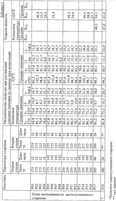В таблице 1 представлен план оптимизации старения и результаты старения образцов пластин из сплава С458 в соответствии с одним из вариантов осуществления настоящего изобретения. Для материала в виде пластины из алюминиево-литиевого сплава С458 (состав, мас.%: Li 1,8, Сu 2,7, Mg 0,3, Zr 0,08, Mn 0,3, Zn 0,6, Al – остальное) был разработан план экспериментов по исследованию старения. Все образцы пластин Р01-Р17 и Р20 подвергались термической обработке на твердый раствор на воздухе при температуре 1020°F в течение 30 минут и охлаждались в воде комнатной температуры. Затем образцы пластин Р01-Р17 и Р20 были подвергнуты холодной обработке, в данном примере путем растяжения при комнатной температуре с достижением относительной деформации 6%. Для предотвращения затвердения материала интервал между охлаждением и растяжением составил менее 2 часов. Охлажденные и растянутые образцы выдерживали при комнатной температуре в течение по меньшей мере 2 суток. После осуществления описанных стадий обработки на твердый раствор, охлаждения и холодной обработки растяжением образцы пластин из сплава С458 соответствовали состоянию Т3. Для придания материалу свойств, соответствующих упрочненному состоянию Т8, сплав С458 в состоянии Т3 обычно подвергают одноступенчатому старению при температуре 300°F в течение 24 часов. При планировании экспериментов, результатом которых является настоящее изобретение, был создан способ двухступенчатого старения, оптимизированный при помощи комплексного 24-факторного эксперимента, в котором в качестве контрольных данных использовались данные стандартного одноступенчатого старения. Комплексный 24-факторный эксперимент включал 24(=16) состояний, отображающих сочетания экстремальных значений параметров (Р01-Р16), и одну центральную точку, отображающую средние значения параметров (Р17). Образец пластины Р20 отображал базисное одноступенчатое старение. Образцы пластин Р01-Р17 и Р20 были подвергнуты искусственному старению до упрочненного состояния Т8 с использованием параметров, приведенных в таблице 1.