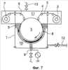 Фиг.7 показывает конструкцию устройства плазмохимического осаждения из паровой фазы намоточного типа предшествующего уровня техники. В устройстве плазмохимического осаждения из паровой фазы намоточного типа предшествующего уровня техники пленка 3 подается из разматывающего барабана 2 в вакуумную камеру 1. Пленка 3 проводится через множество вспомогательных барабанов 4 к периферической поверхности раскатного цилиндра 5, имеющего источник тепла, и потом пленку наматывают на наматывающий барабан 7 через множество вспомогательных барабанов 6. Раскатный цилиндр 5 соединен с потенциалом земли и помещен в положение лицевой стороной к высокочастотному электроду 8, форма которого представляет собой дугу окружности. Реакционный газ подается между раскатным цилиндром 5 и высокочастотным электродом 8 через линию подачи газа 9, и затем создается плазма реакционного газа, с тем, чтобы реакционный продукт осаждался на пленке, намотанной вокруг раскатного цилиндра 5.
