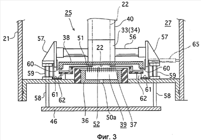 Оба конца вращающейся оси 56 вышестоящего подвижного барабана 33 (и оба конца вращающейся оси нижестоящего подвижного барабана 34, как изложено ниже) поддерживаются опорными кронштейнами 57, и, следовательно, положение перемещения пленки 22 регулируется. Опорные кронштейны 57 присоединены к подъемному устройству 46, расположенному снаружи нижней части вакуумной камеры 21, через резьбовые штифты подъемного устройства 58. Таким образом, вышестоящий подвижной барабан 33 может быть поднят или опущен движением подъемного устройства 46.