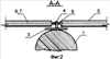 Известно и является наиболее близким к предлагаемому устройство для строительства дорог на слабых грунтах, включающее плавучие опоры для дорожного покрытия (прототип тот же, что и в предлагаемом способе). Причем плавучие опоры в известном устройстве выполнены в виде эластичных надувных камер с боковыми гофрированными поверхностями, соединенных с магистральными и подводящими воздуховодами. При монтаже дорожного покрытия магистральный воздуховод подключается к источнику сжатого воздуха, и производится заполнение камер воздухом. Однако известное устройство отличается значительным расходом металла, а также повышенной трудоемкостью при монтаже, кроме того, выход воздуха из камер может привести к опусканию полотна. Существенным недостатком известного устройства является недостаточная надежность его в эксплуатации.