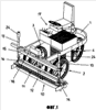 1. Машина для распределения материалов на полу, содержащая несущий узел, расположенный на трех независимых колесных узлах, при этом по меньшей мере один из упомянутых колесных узлов выполнен с возможностью его ориентирования для осуществления рулевого управления машиной, нивелирующую головку в передней части несущего узла, причем нивелирующая головка имеет элемент для распределения и нивелирования наносимых материалов, при этом колесные узлы (2, 3, 4), на которые опирается машина, соединены системой гидравлического привода, с возможностью отдельного и избирательного перекрытия рабочей жидкости в каждый из упомянутых узлов сообразно с приводным усилием и скоростью машины; при этом нивелирующая головка (10) установлена в узле на опоре (15), обеспечивающей возможность движения упомянутой головки (10) в стороны по отношению к ее положению спереди машины, отличающаяся тем, что головка (10) опирается на опору (15) посредством вертикальных регулируемых по высоте цилиндров (13), соединенных с головкой (10) посредством виброгасителей (14), предотвращающих передачу вибрации машины к элементам упомянутой головки (10); причем каждый колесный узел (2, 3, 4) имеет фиксатор (9) сцепления, соединенный с системой привода, избирательно позволяя любой группе из числа упомянутых групп (2, 3, 4) выполнять сцепление с приводной трансмиссией и отсоединяться от нее.