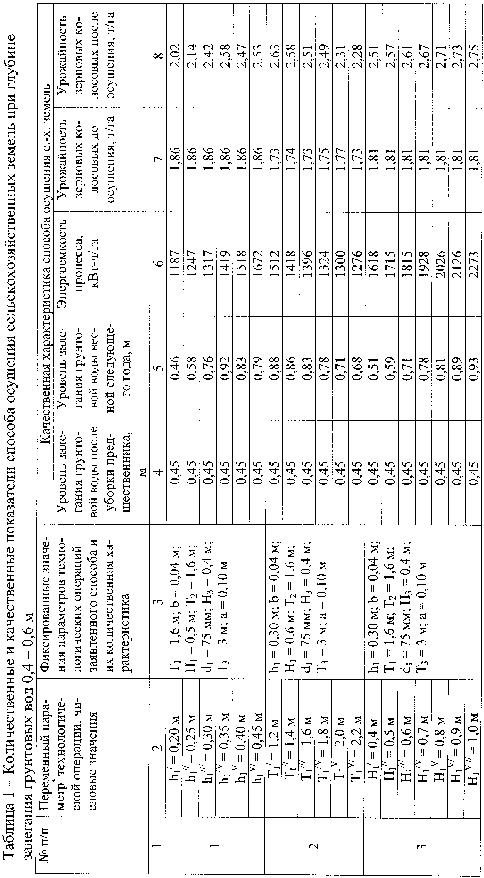 В таблице 1 представлены количественные и качественные показатели последействия заявленного способа осушения сельскохозяйственных земель при глубине залегания грунтовых вод в диапазоне 0,4-0,6 м.