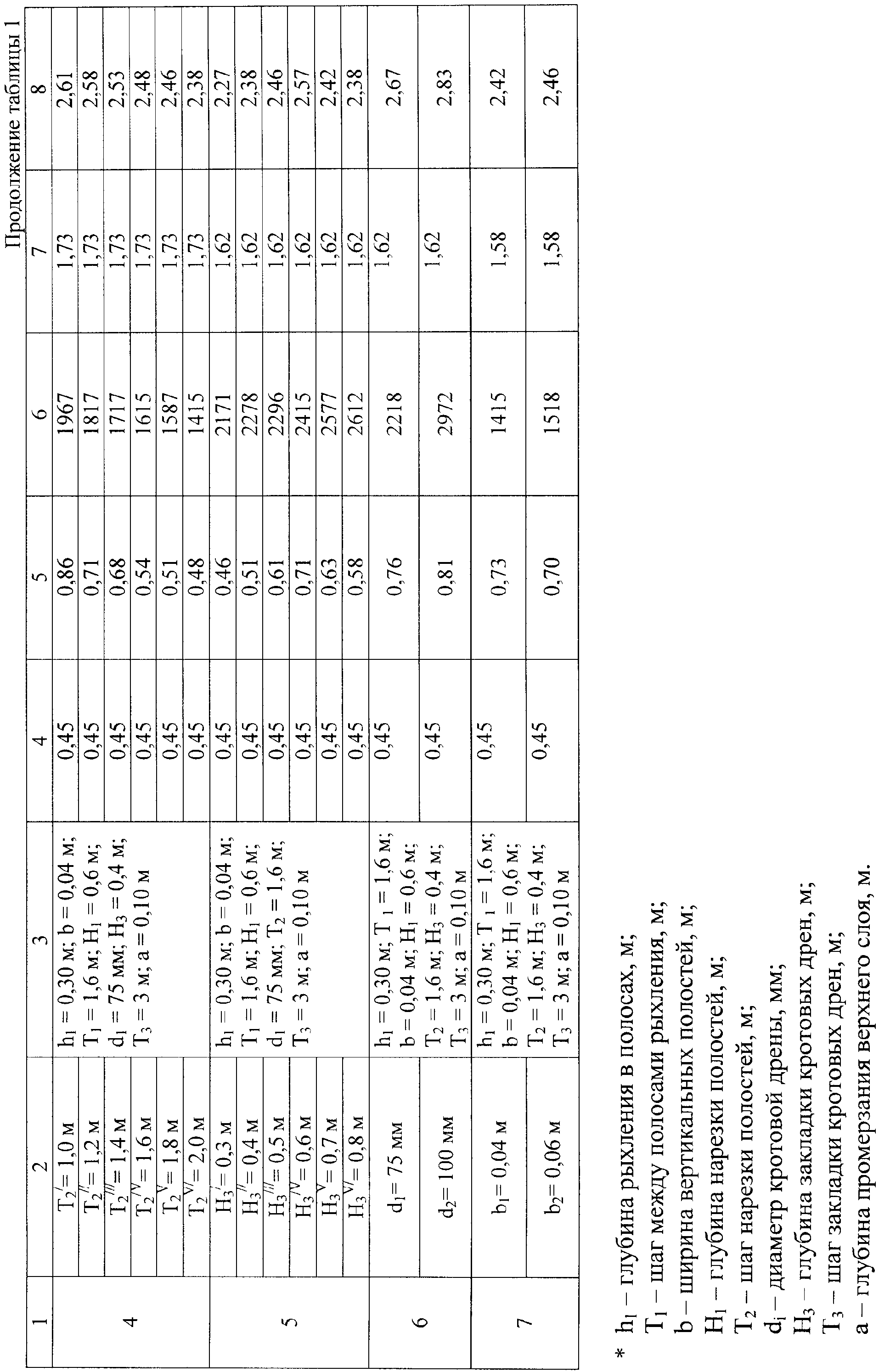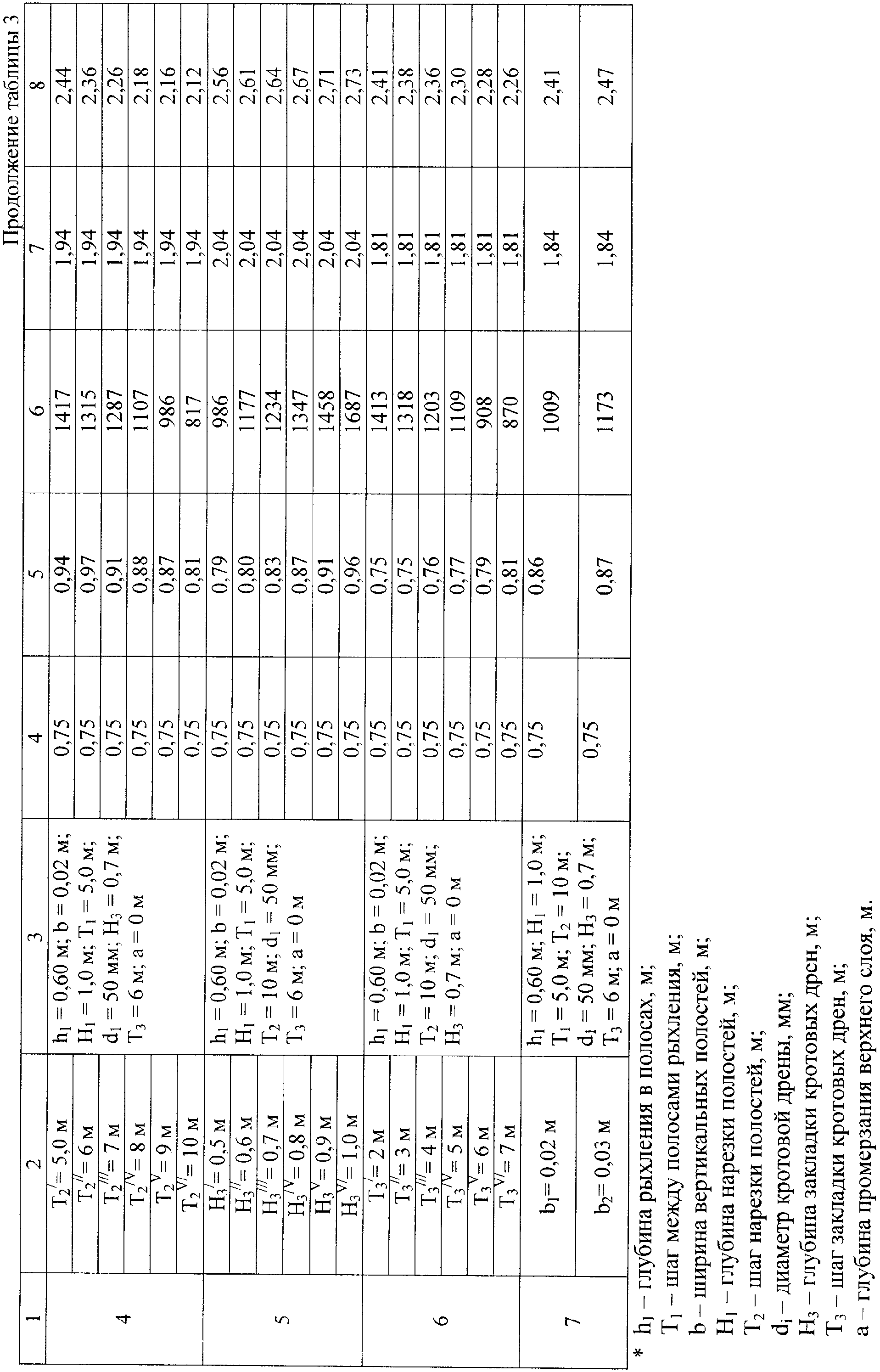 Оптимальный шаг рыхления T1 между полосами 4 выполнен в серии полевых опытов при следующих постоянных, фиксированных значениях технологических параметров: h1=0,30 м; b=0,04 м; H1=0,6 м; Т2=1,6 м; d1=75 мм; Н3=0,4 м; Т3=3 м; а=0,10 м (см. данные таблицы 1, поз.2). Уменьшение шага T1 нарезки полос 4 рыхления с 2,2 до 1,2 м приводит к снижению залегания грунтовой воды с уровня 0,68 м до отметки 0,88 м. Урожайность зерна ячменя с 2,28 т/га при этом увеличилась до 2,63 т/га, а на контроле составила лишь 1,73 т/га. Однако энергозатраты при увеличении шага с 1,2 м до 2,2 м резко снижаются. Шаг T1=1,6 1,8 м между полосами 4 является наиболее приемлемым.