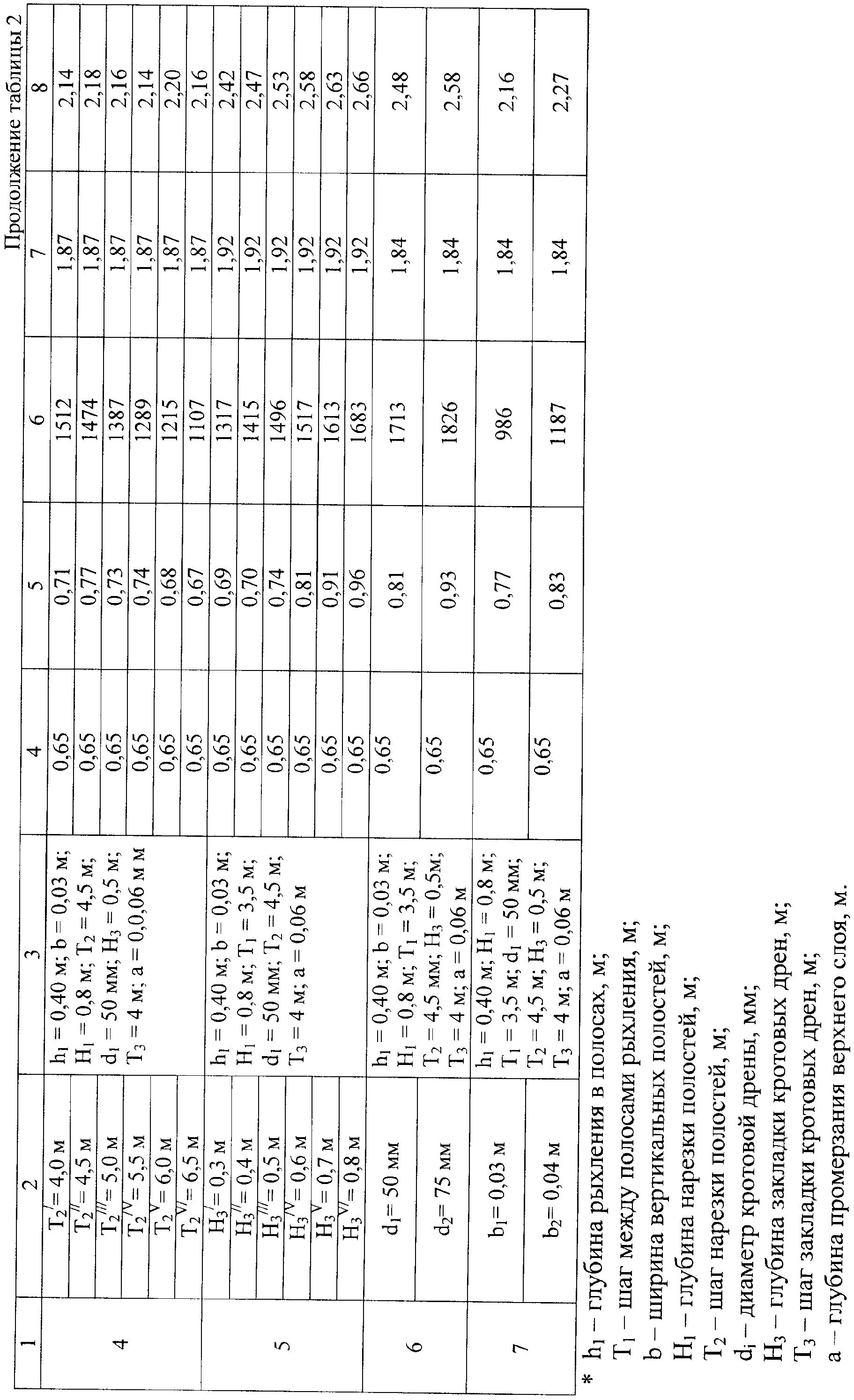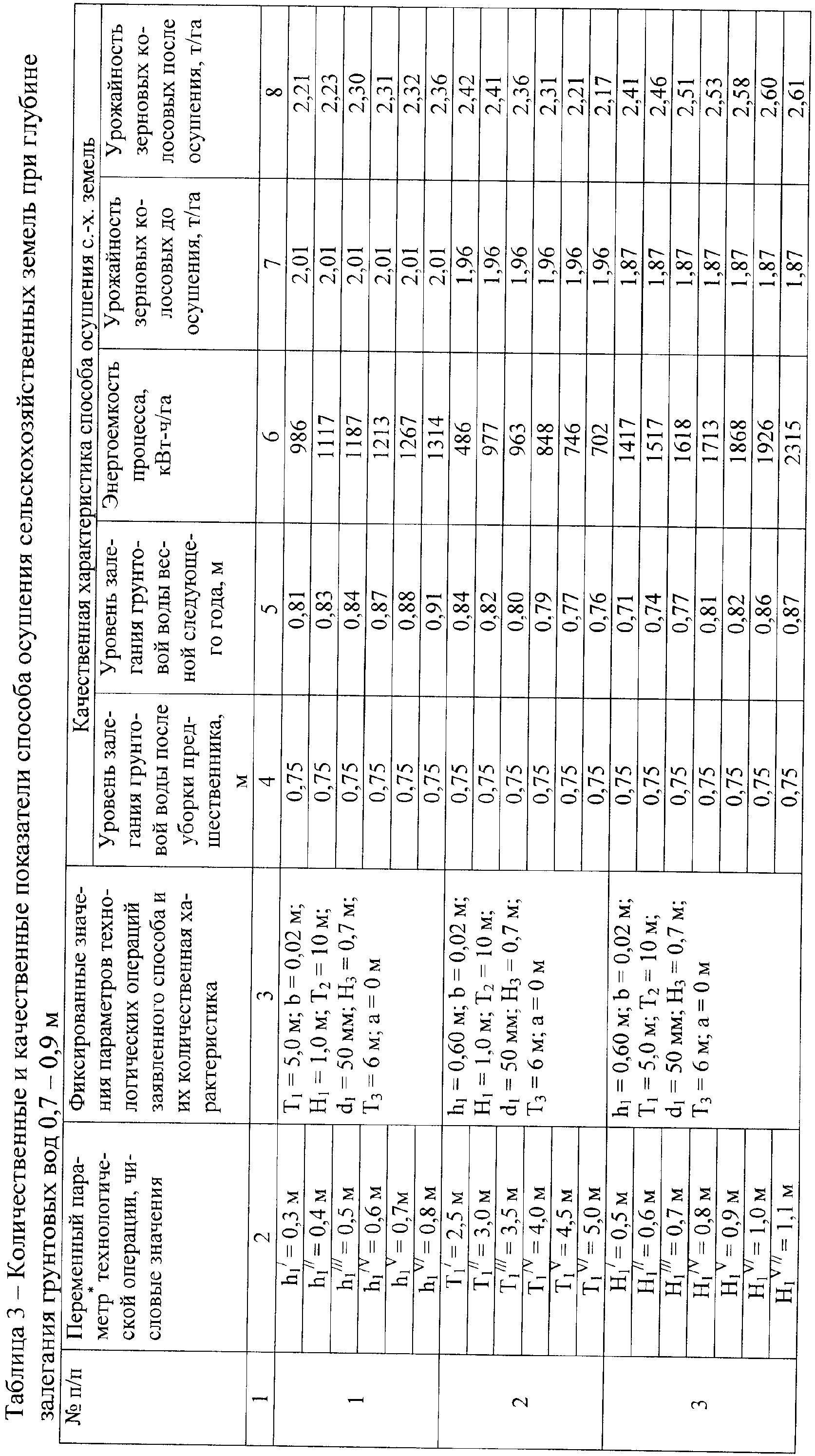 Влияние глубины рыхления в полосах (h1), шага между полосами рыхления (T1), ширины вертикальных полостей (b), глубины нарезки полостей (H1), шага нарезки полостей (Т2) на осушаемом массиве, диаметра кротовой дрены (di), глубины закладки кротовых дрен (Н3), шага (Т3) между ними и глубины промерзания верхнего слоя «а» для обеспечения тяговосцепных качеств агрегатируемых тракторов на уровень залегания грунтовой воды к периоду высева ярового ячменя сорта Донецкий 8 на энергоемкость указанных технологических процессов и урожайность зерна ячменя отражено числовыми данными в таблице 2.