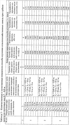 Глубина Н3 закладки дрен 7 существенно влияет на отвод избыточной влаги. В таблице 1 показано влияние глубины Н3 закладки дрен 7 на уровень грунтовой воды после выполнения всех технологических операций, суммарные энергозатраты и урожайность ярового ячменя сорта Донецкий 8. Из приведенных данных следует то, что при закладке кротодрен 7 с шагом Т3=3 м оптимальной следует считать глубину прокладки дрен 0,4-0,5 м.