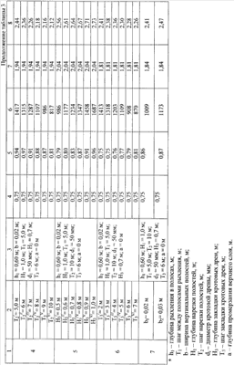 Во второй колонке таблицы 1 представлен переменный, варьируемый параметр h1 I h1 IV – глубина рыхления верхнего пахотного слоя и подпахотного горизонта в полосах 4 в диапазоне глубин от h1 I=0,20 м до h1 IV=0,45 м с интервалом 5 см. Экспериментальный рабочий орган, имеющий V-образную форму и толщину не более 16 мм, средствами крепления смонтирован на раме любого почвообрабатывающего орудия. Орудие снабжено рамой, кронштейнами и пальцами для навески рамы на тяги гидронавесной системы агрегатируемого трактора и опорное колесо с винтовым механизмом. Для получения достоверных экспериментальных данных по энергооценке и установления тягового сопротивления на вертикальных стойках экспериментального рабочего органа выполнена группа отверстий диаметром 24 мм для изменения глубины рыхления с интервалом 0,05 м. Перед закладкой серии опытов на осушаемом поле за счет выполнения почвенного разреза был установлен уровень залегания грунтовой воды после уборки предшественника (Нгр=0,45 м, см. колонку 4 табл.1).