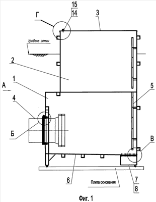 На фиг.1 представлен общий вид предпочтительной конструкции колодца, предназначенного для установки на концевом участке трубопровода. На фиг.2-5 представлены виды на фиг.1: на фиг.2 – вид А; на фиг.3 – вид Б; на фиг.4 – вид В, на фиг.5 – вид Г.