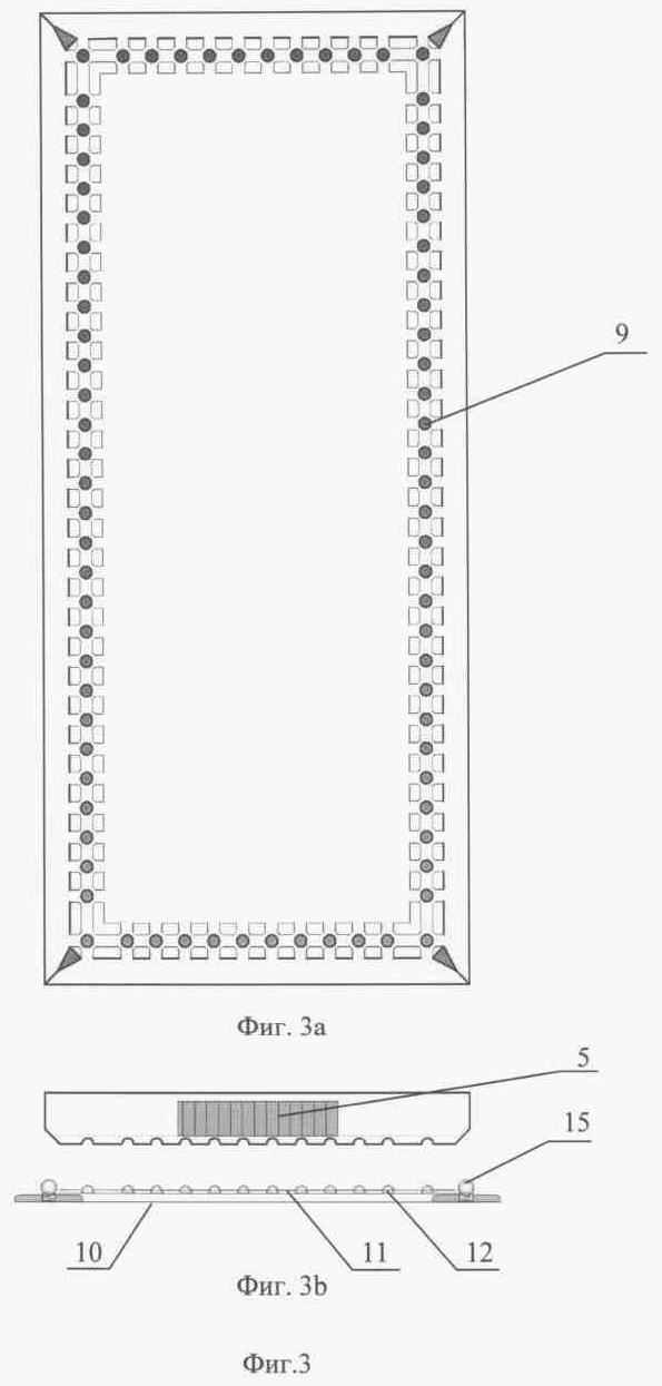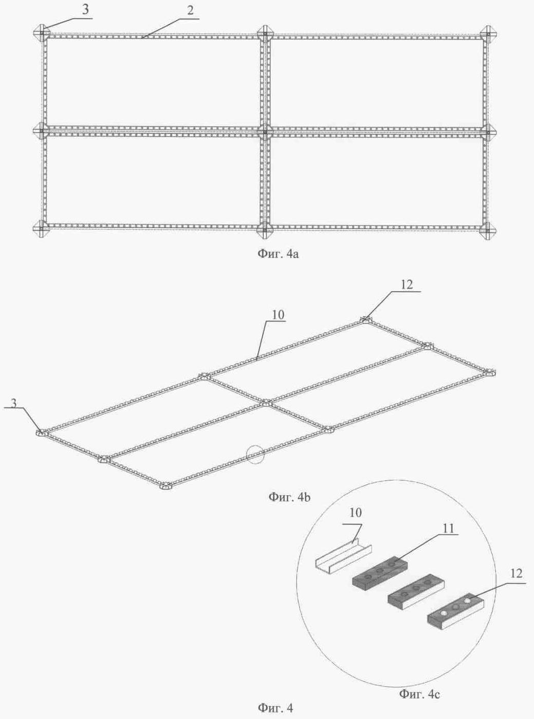 Фиг.4 – конструкция рамы-модуля металлического каркаса, с укрепленными в них подушками-держателями, с углублениями под шары (фиг.4а – вид сверху; фиг.4в; фиг.4с – вид сбоку).