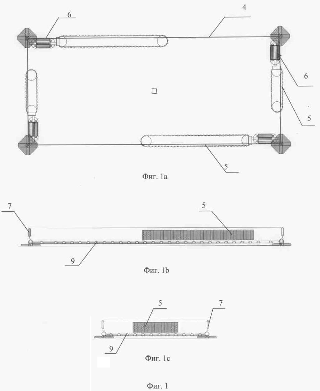 Фиг.1 – конструкция платформы-поддона, на боковые стенки которого помещены зубчатые резиновые ленты и электродвигатели (фиг.1а – вид сверху; фиг.1в; фиг.1с – вид сбоку).