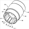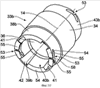 Исходя от расположенной к корпусу 13 боковой стенки 37 располагается образованный заодно с нажимным отрезком 34 первый упорный отрезок 38. Первый упорный отрезок 38 сформирован трубчато и не опирается на приемный отрезок 24 корпуса 13. Упорный отрезок 38 имеет вдоль внутреннего объема несколько равномерно по дистанции расположенных и вдоль центральной продольной оси 14 размещенных, а также в направлении покрытия фрикционного демпфирования 36 сужающихся продольных пазов 39, которые размещаются до покрытия фрикционного демпфирования 36. Тем самым покрытие фрикционного демпфирования лежит свободно в области пазов 39 в осевом направлении. По два паза 39 лежат диаметрально противоположно друг к другу. Между двумя расположенными рядом друг с другом пазами 39 находится клин 40, который в противоположном направлении от пазов 39 сужается и проходит рампообразно в направлении боковой стенки 37 и также заоодно с ней образован. Каждый клин 40 имеет боковые стенки 41, которые соответственно ограничивают основу 42 соседнего паза 39. Каждая основа паза проходит в направлении покрытия фрикционного демпфирования 36 также рампообразно.