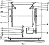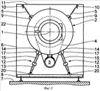 В нижней части стирального агрегата 2 центрально расположены два ниже подробно описываемых фрикционных демпфера 12, которые соединены с рамой машины 8. Каждый фрикционный демпфер 12 имеет трубчатый корпус 13 с центральной продольной осью 14, по которой коаксиально подвижно проводится шток 15. Шток 15 имеет на свободном конце первый элемент крепления 16, с помощью которого фрикционный демпфер 12 прикреплен на подшипнике 17 к стиральному агрегату 2 таким образом, что фрикционный демпфер 12 может поворачиваться вокруг поворотной оси 18, параллельной барабанной оси 1 относительно стирального агрегата 2. На свободном конце корпуса 13 расположен второй элемент крепления 19, с помощью которого фрикционный демпфер 12 прикреплен к подшипнику 20 рамы машины 8 таким образом, что фрикционный демпфер 12 может поворачиваться вокруг оси 21, параллельной барабанной оси 1 относительно рамы машины. Подача и изъятие белья происходит с помощью расположенной на стиральном агрегате откидной заслонки 22.