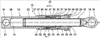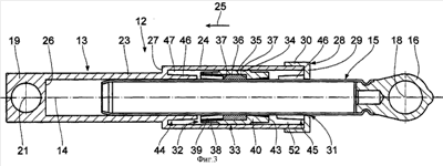 В корпусе 13 в области приемного отрезка 24 размещен узел фрикционного демпфинирования 32. Узел фрикционного демпфирования 32 имеет вдоль центральной продольной оси 14 нажимной поршень 33. Нажимной поршень 33, в основном трубчато сформированный, и включает центрально расположенный отрезок нажатия 34, в котором расположен противоположно штоку 15 кольцевой паз 35. В кольцевом пазе располагается кольцеобразное сплошное эластичное покрытие фрикционного демпфирования 36, которое опирается на боковые стенки кольцевого паза 37, так что относительного нажимного поршня 33 он предохраняется от смещения и трется о шток 15. Боковые стенки 37 кольцевого паза 35 сконструированы таким образом, что нажимной поршень 33 проводится вдоль центральной продольной оси 14 по штоку 15.