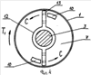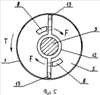 Работает гидравлический демпфер следующим образом. При движении штоков 2 и 3, а следовательно, и частей поршня 5 и 7 по стрелке А (рабочий ход гидравлического демпфера) рабочая жидкость 16 перемещается по стрелкам В в каналах 9 и 11 и ее поток, истекая под давлением из выступов 10, взаимодействует с лопастями 13 лопастного колеса 12, которое получает угловой поворот по стрелкам С. Получив такой угловой поворот, лопасти 13 плотно прижимаются к выступам 8 части поршня 5, что способствует току рабочей жидкости 16 в каналы 9 только через отверстия большего диаметра 15. При этом протекающий объем рабочей жидкости 16 через отверстие 10 является относительно значительным, что способствует возникновению вращающего момента Т, воспринимаемого полым штоком 2. Под действием этого момента происходит упругая угловая деформация полого штока 2 и, следовательно, демпфирование составляющей нагрузки, приложенной к демпферу в этом направлении. При движении штоков 2 и 3, а также вместе с ними частей поршня 5 и 7 в направлении, обратном стрелке А (режим отдачи демпфера), рабочая жидкость 16 поступает в каналы 9 выступов 8 по стрелке Е и, протекая по ним, взаимодействует с лопастями 13 лопастного колеса 12, поворачивая его по стрелкам F примыкая к выступам 10. В этом случае отверстия 14 лопастей 13, имея меньший диаметр, снижают расход жидкости 16, протекающей по каналам 11 выступов 10 в направлении, противоположном стрелке В, а следовательно, давление ее возрастает и на части поршня 7 возникает вращающий момент T1, который будет по величине большим момента Т. Такой момент обеспечит упругий угловой поворот сплошного штока 3, который повысит эффект гашения нагрузки, действующей в режиме отдачи за счет своей повышенной крутильной жесткости. Далее описанные процессы могут повторяться неоднократно.