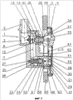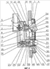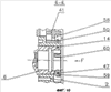 Седло 9 показано на фиг.4 в разрезе в открытом состоянии клапана 8. С выходной стороны седло 9 снабжено радиальными спицами 44, которые равномерно разнесены по окружности и образуют центрально расположенную опору 10 для первой части 11 толкателя, состоящего из двух частей 11, 12, причем обе части соединены между собой с помощью пружинного элемента 13 с кинематическим замыканием соединения. На конце толкателя с входной стороны по направлению газового потока установлен упор 16, положение которого по длине толкателя предпочтительно может регулироваться для установки и регулировки расхода потока, от которого зависит закрытие клапана, как это будет описано далее. За упором 16 по направлению потока на толкателе установлена тарелка 15 клапана, подвижная в продольном направлении толкателя. Между тарелкой 15 клапана и упором 16 установлено кольцо 17 круглого сечения, служащее упругим уплотнительным элементом. Под действием пружины 18, опирающейся на спицы 44, тарелка 15 клапана прижимается в открытое положение к уплотнительному кольцу 17, а в закрытом положении она прилегает к упругому уплотнительному элементу, также выполненному в виде кольца 55 круглого сечения, помещенного в седле 9.