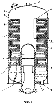 В полости корпуса 1 продольно установлены трубчатые ширмы, каждая из которых имеет внутреннюю ветвь 7 и наружную ветвь 8. Внутренняя ветвь 7 установлена между наружной ветвью 8 и вытеснителем 9, прикрепленным к центральному коллектору 4, а наружная ветвь 8 выполнена как продолжение внутренней ветви 7 и размещена у стенки корпуса 1.