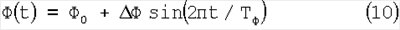 при индексе  фазовой модуляции и периоде модуляции Тф, составляющими порядка нескольких секунд в одном варианте осуществления. При подобном медленном регулировании изменения фазы частота колебаний системы в замкнутом контуре будет непрерывно изменяться, как показано фазовой кривой, представленной на фиг.4B. Поэтому, для каждого периода времени Тф все соответствующие переменные ( 0, 1, 2 и массовый расход) можно измерить прослеживанием соответствующей амплитудной характеристики по непрерывному спектру рабочих частот E[ 1, 2], без необходимости абсолютной калибровки амплитудной характеристики.