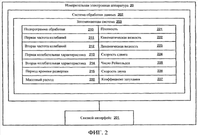 На фиг.2 показана измерительная электронная аппаратура 20 в соответствии с вариантом осуществления изобретения. Измерительная электронная аппаратура 20 содержит связной интерфейс 201, систему 202 обработки данных и запоминающую систему 203. Система 202 обработки данных связана со связным интерфейсом 201.