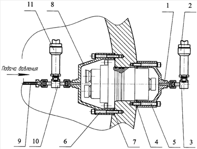 С внутренней стороны сосуда аналогичным образом герметично с помощью крепежных болтов 6 через уплотнительный элемент 7 крепится приемник испытательного давления 8. Подача испытательного давления осуществляется через трубопровод 9 и тройник 10, связывающий герметичными соединениями трубопровод и приемник испытательного давления. Датчик-регистратор испытательного давления 11 расположен на тройнике.