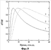 Известно и проверено нами на исследуемых образцах изделий из стали, что при небольших температурах нагрева T (в эксперименте T составляло около 25°С) корреляционная функция линейно связана с величиной перемещения спеклов. Тепловое расширение стали пропорционально первой степени температуры при небольших температурах нагрева. И именно из-за теплового расширения происходит смещение спеклов. Как видно, из-за эффекта насыщения КФ (спадания до нуля) нагрев T связан со средним размером спеклов и существенно ниже диапазона температур линейного теплового расширения стали. С учетом сделанных выше замечаний в качестве характеристики теплового поля нами введена функция F(T,r)=1-cor(T,r), которая может использоваться в качестве оптического аналога термодинамической температуры для стального образца (условное название – оптическая температура ). Сходство «оптической температуры» и термодинамической иллюстрируется фиг.7-13. На фиг.7 показана временная зависимость термодинамической температуры, полученная из численного решения пространственно-одномерного уравнения теплопроводности для стали при трех фиксированных значениях координаты z, а на фиг.8 – зависимость вида (1) F(T,r)=1-cor(T,r), полученная на основе экспериментальных данных. Первое существенное сходство функции термодинамической температуры Т и функции F(T,r) от времени t состоит в том, что они имеют точку перегиба, т.е. точку максимума первой производной по времени. Из пространственно-одномерного уравнения теплопроводности следует, что коэффициент термической диффузии k равен z2/2t (при условии пренебрежения шириной пучка), где (z,t) – координаты максимума функции dT/dt. Положение этого максимума смещается во временной координате вправо (запаздывание) при удалении (увеличении координаты z) точки измерения температуры от источника тепла. На фиг.9 представлена зависимость производной термодинамической температуры Т от времени t для случаев, соответствующих фиг.7 (номер графика растет с ростом z).