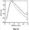 на фиг.13 – зависимость производной термодинамической температуры Т от времени t, полученная из численного решения пространственно-одномерного уравнения теплопроводности при значениях коэффициента термической диффузии k для стали, найденных на основании экспериментальных данных из фиг.12.