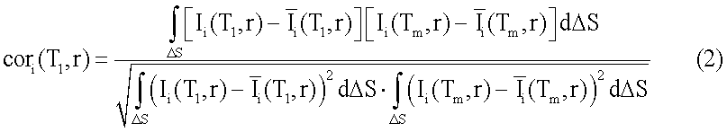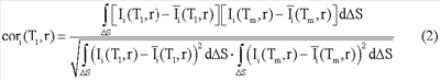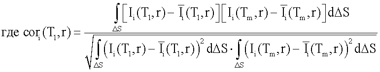– корреляционная функция, I – интенсивность отраженного излучения, r=(x,y) – координаты точки фрагмента спекл-изображения, T1, Tm – температуры получения спекл-изображений, i=1 M – номер фрагмента спекл-изображения, m=1 N – номер спекл-изображения, полученного от объекта при температуре Tm,