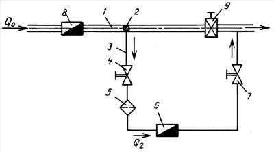 Отфильтрованная контрольным фильтром 5 жидкость, пройдя расходомер 6 магистрали отбора проб 3, возвращается в трубопровод 1 в основной поток за устройством регулирования расходов 9.