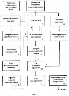 Устройство для осуществления способа содержит (см. фиг.1) коммутирующий элемент 2, выход которого соединен с входом вихретокового преобразователя 3, задающий генератор видеоимпульсов 7, источник стабильного постоянного тока 1, выход которого соединен с первым входом коммутирующего элемента 2, узел выборки – хранения 11, замыкатель 8, элемент задержки 13, формирователь импульсов 14, усилитель согласующий 4, однополупериодный детектор 5, первый фильтр нижних частот 6, обнуляемый интегратор 9, второй фильтр нижних частот 10, узел линеаризации 12 и формирователь выходного напряжения 15, при этом выход задающего генератора видеоимпульсов 7 соединен с входом замыкателя 8, со вторым входом коммутирующего элемента 2 и входом элемента задержки 13, выход которого соединен с входом формирователя импульсов 14, а выход формирователя импульсов 14 – со вторым входом узла выборки-хранения 11, второй вход обнуляемого интегратора 9 соединен с первым выходом замыкателя 8, второй выход которого соединен с третьим входом обнуляемого интегратора 9, последовательно соединены вихретоковый преобразователь 3, усилитель согласующий 4, однополупериодный детектор 5, первый фильтр нижних частот 6, обнуляемый интегратор 9, второй фильтр нижних частот 10, узел выборки-хранения 11, узел линеаризации 12 и формирователь выходного напряжения 15, выход которого является выходом устройства.