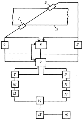 Пример. На чертеже приведена схема устройства для реализации предлагаемого способа измерения. На схеме изображены датчик, выполненный в виде оппозитно расположенных по отношению друг к другу ультразвуковых пьезопреобразователей 1, 2 и под углом относительно оси трубопровода 3. Ультразвуковые пьезореобразователи 1, 2 соединены при помощи высокочастотных кабелей соответственно с формирователями импульсов 4, 5 и усилителем – приемником 6. Формирователи импульсов 4, 5 и усилитель – приемник 6 через блок управления подачей импульсов 7 соединены соответственно с генераторами ультразвуковых колебаний 8, 9, которые, в свою очередь, соединены через масштабные усилители 10, 11 с соответствующими цифроаналоговыми преобразователями 12, 13. Электрические сигналы с цифроаналоговых преобразователей 12, 13 поступают в блок суммирования 14 и далее в электронный вычислительный блок 15. В электронный вычислительный блок 15 поступает также сигнал от измерителя плотности 16. В электронном вычислительном блоке 15 вычисляется сжимаемость, связанная функциональной зависимостью с содержанием свободного газа в нефти