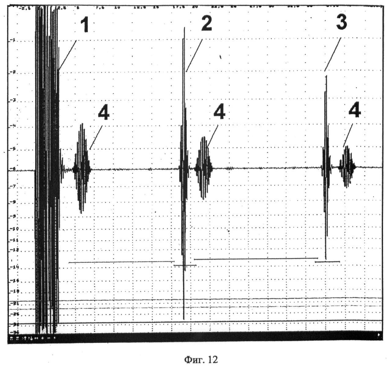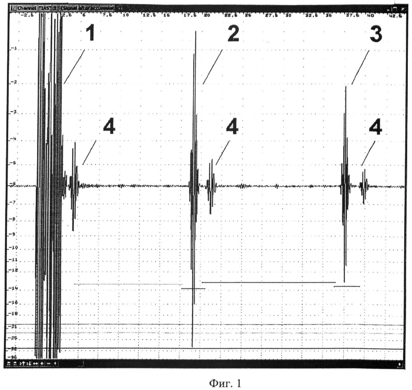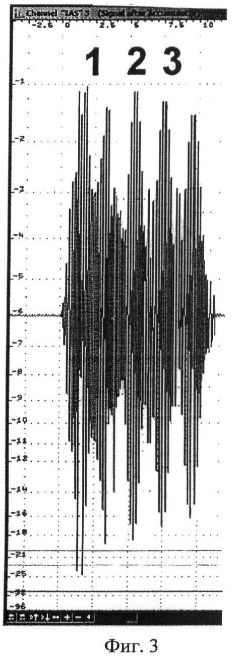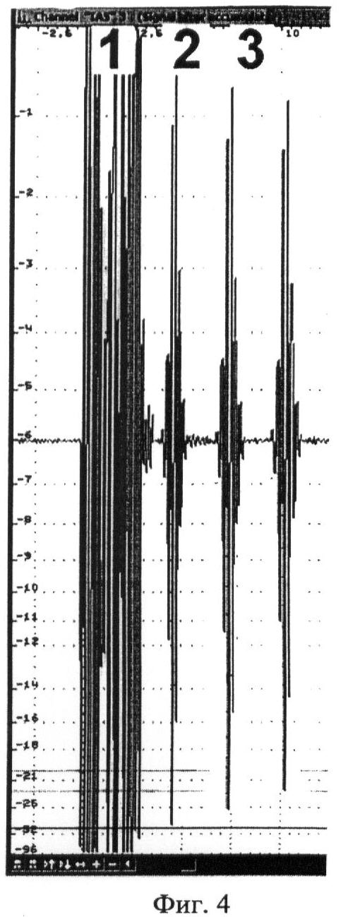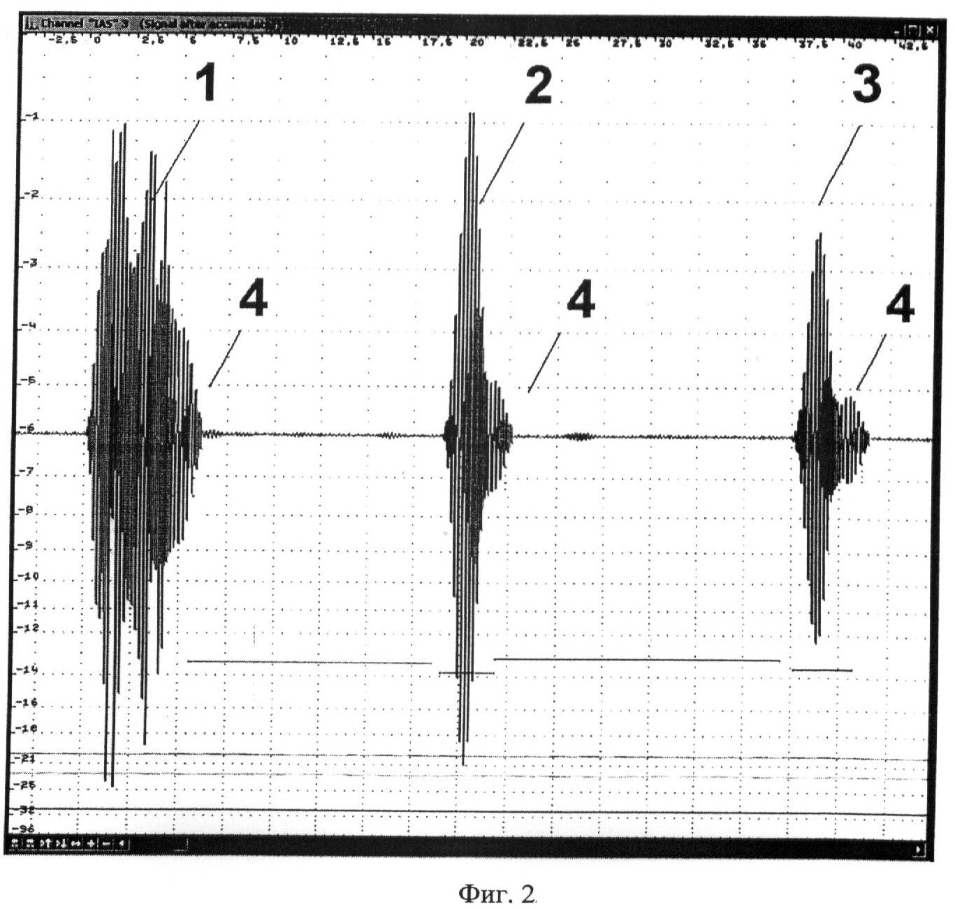2. Возможность выявлять дефекты, расположенные в непосредственной близости к естественным отражателям. По фиг.2 мы не можем с уверенностью отметить факт наличия или отсутствия некоторых сигналов, отраженных от дефектов, которые, тем не менее, отчетливо видны на фиг.1.