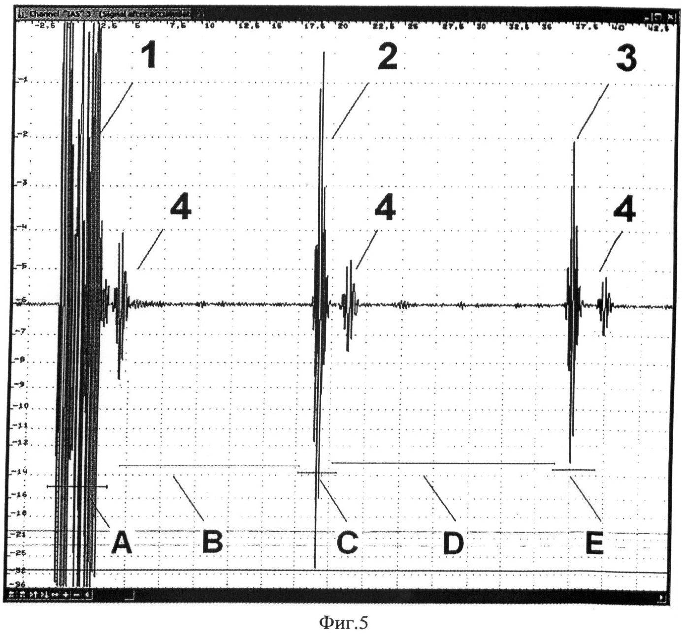 В общем случае, для оценки качества изделия необходимо знать как минимум следующие параметры: амплитуды донных сигналов 2, 3 (см. фиг.5, сигналы в зонах С, Е соответственно) и амплитуды сигналов в зонах В и D.